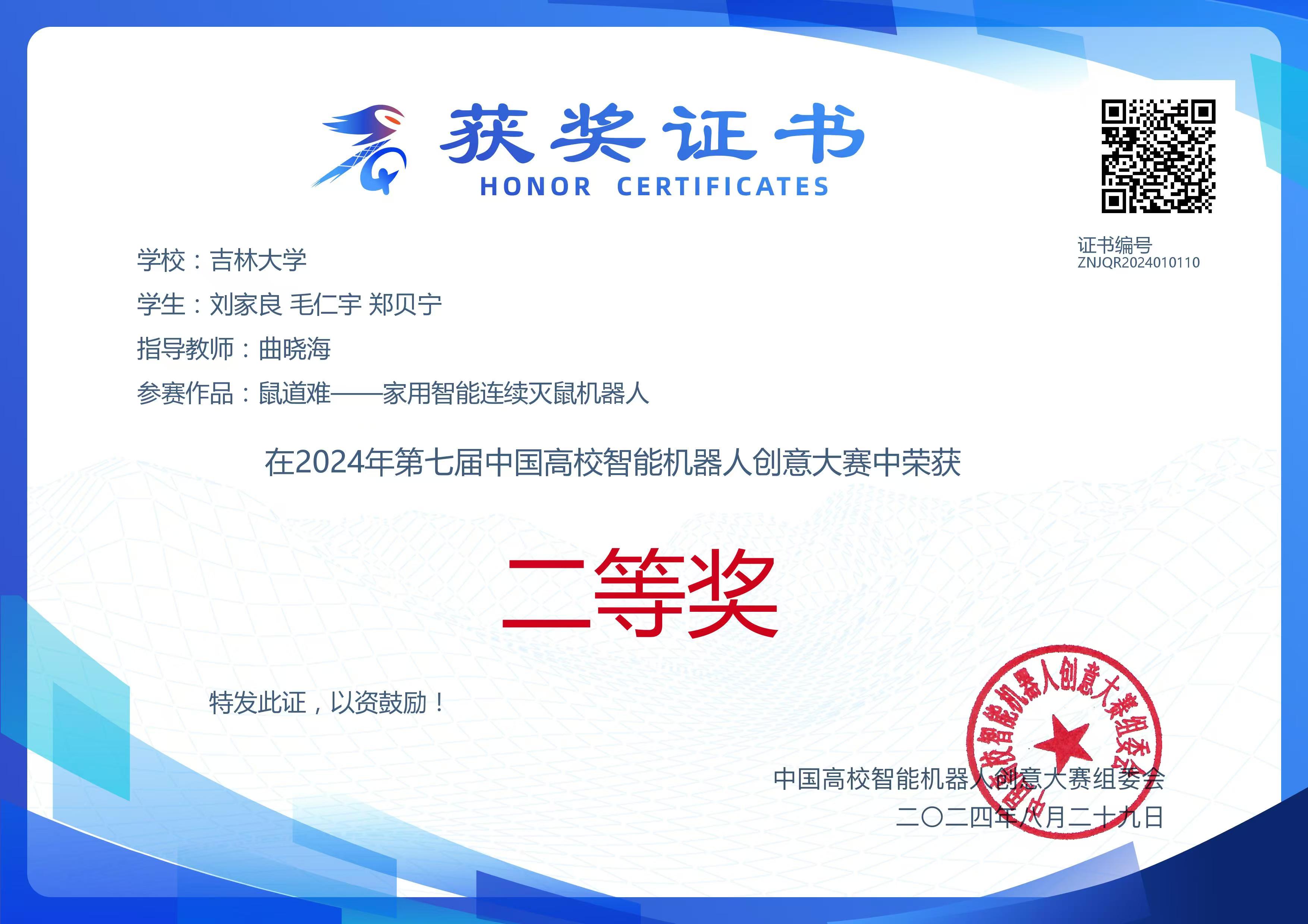 刘家良、毛仁宇、郑贝宁的作品“鼠道难—家用智能连续灭鼠机器人”(指导教师:曲晓海)荣获全国二等奖。
