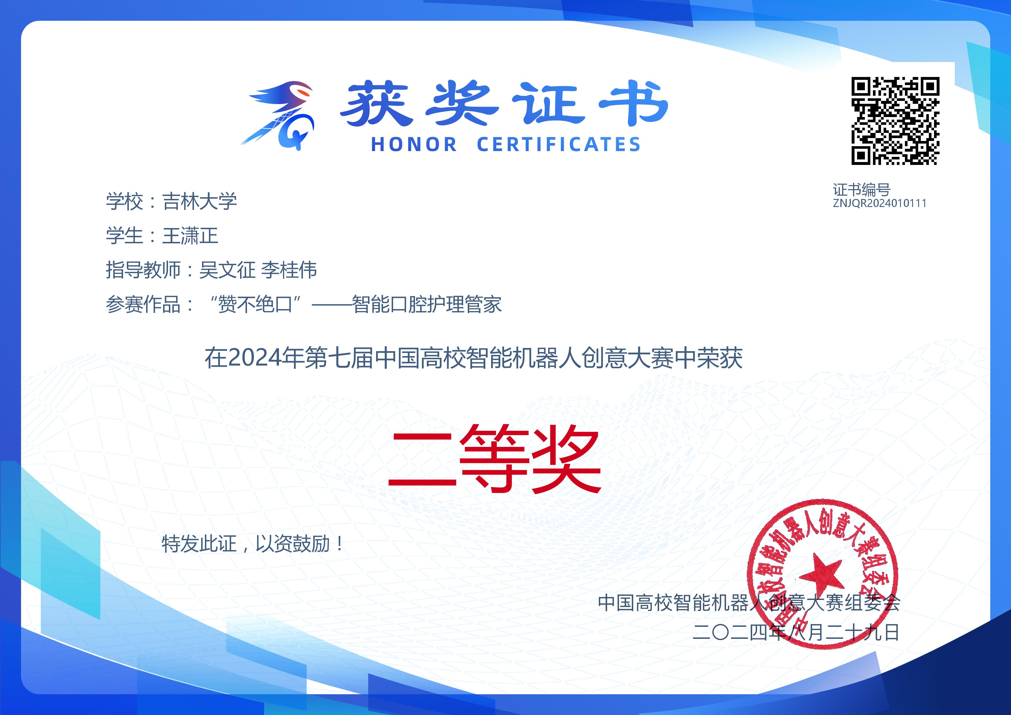 王潇正的作品““赞不绝口”—智能口腔护理管家”(指导教师:吴文征、李桂伟)荣获全国二等奖。