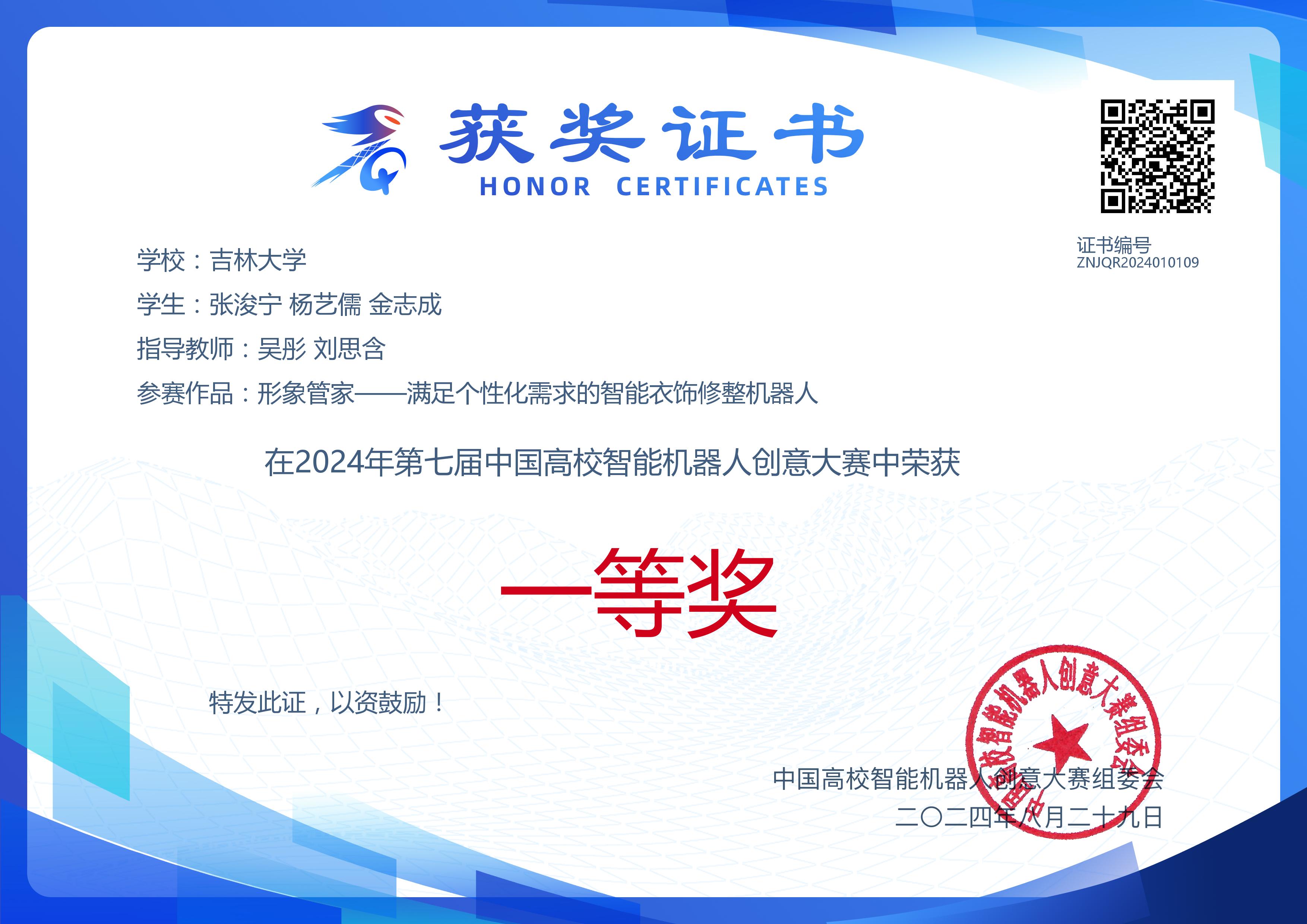 张浚宁、杨艺儒、金志成的作品“形象管家—满足个性化需求的智能衣饰修整机器人”(指导教师:吴彤、刘思含)荣获全国一等奖。