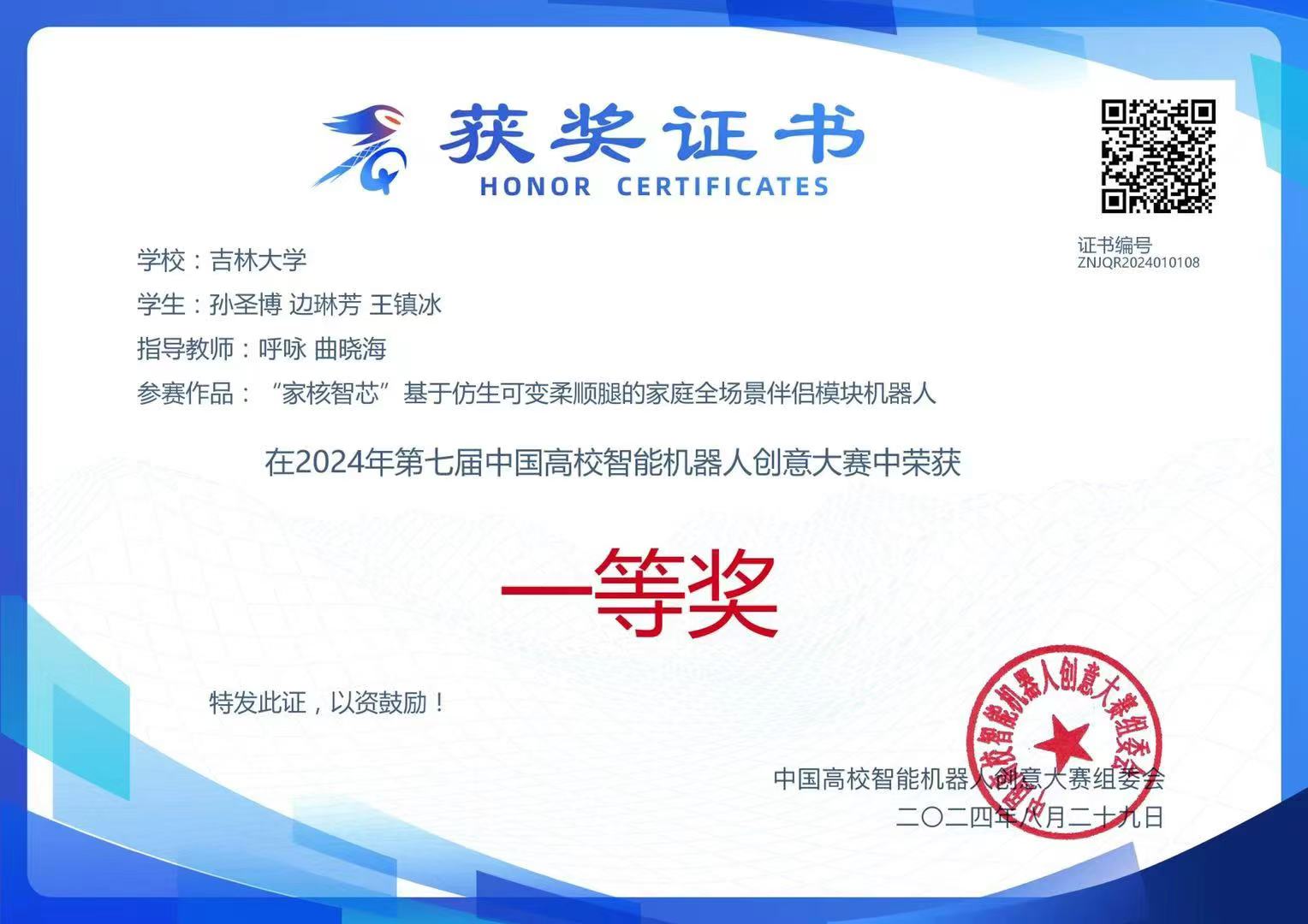 孙圣博、边琳芳、王镇冰的作品“”家核智芯“基于仿生可变柔顺腿的家庭全场景伴侣模块机器人”(指导教师:呼咏、曲晓海)荣获全国一等奖。
