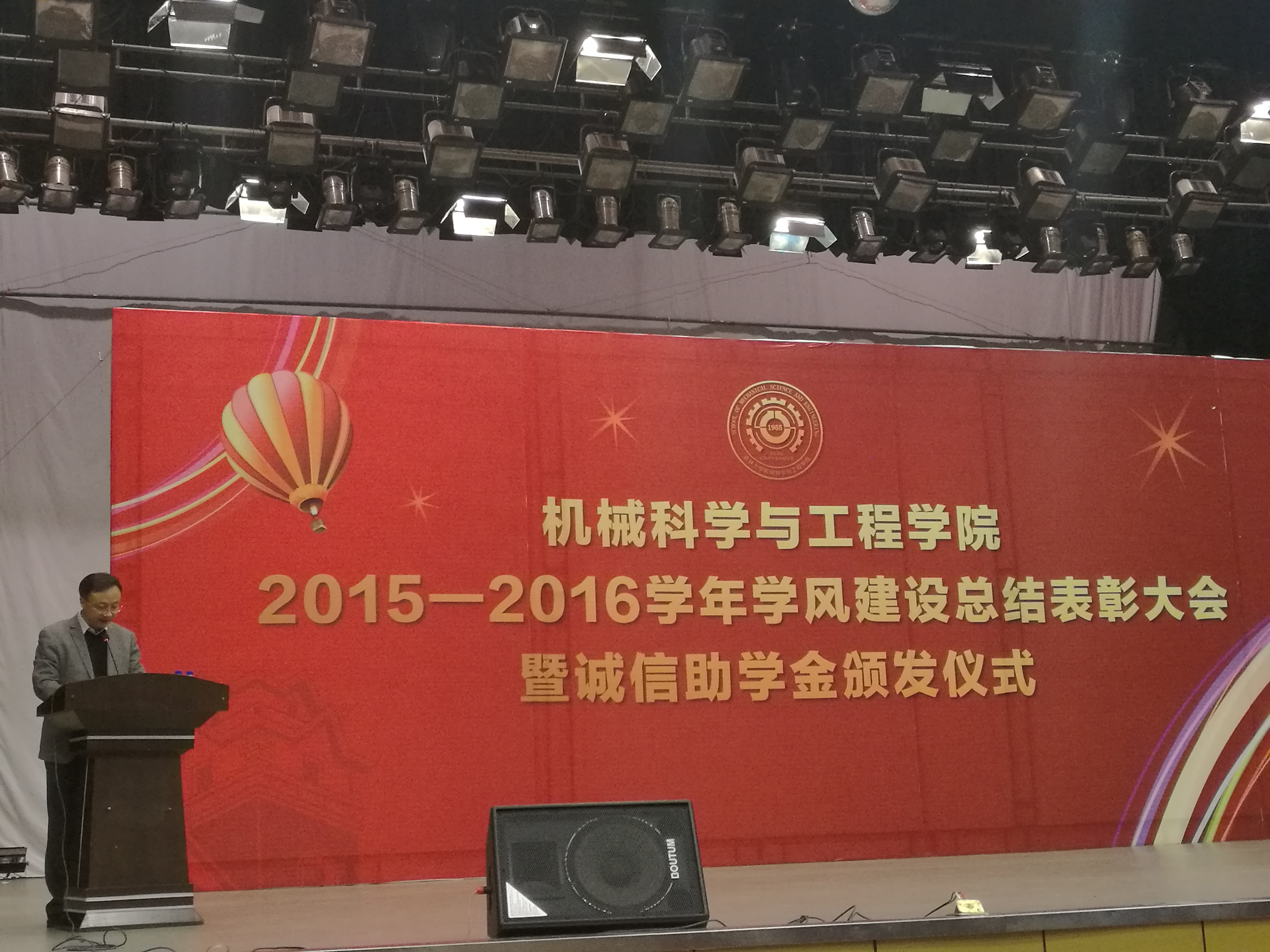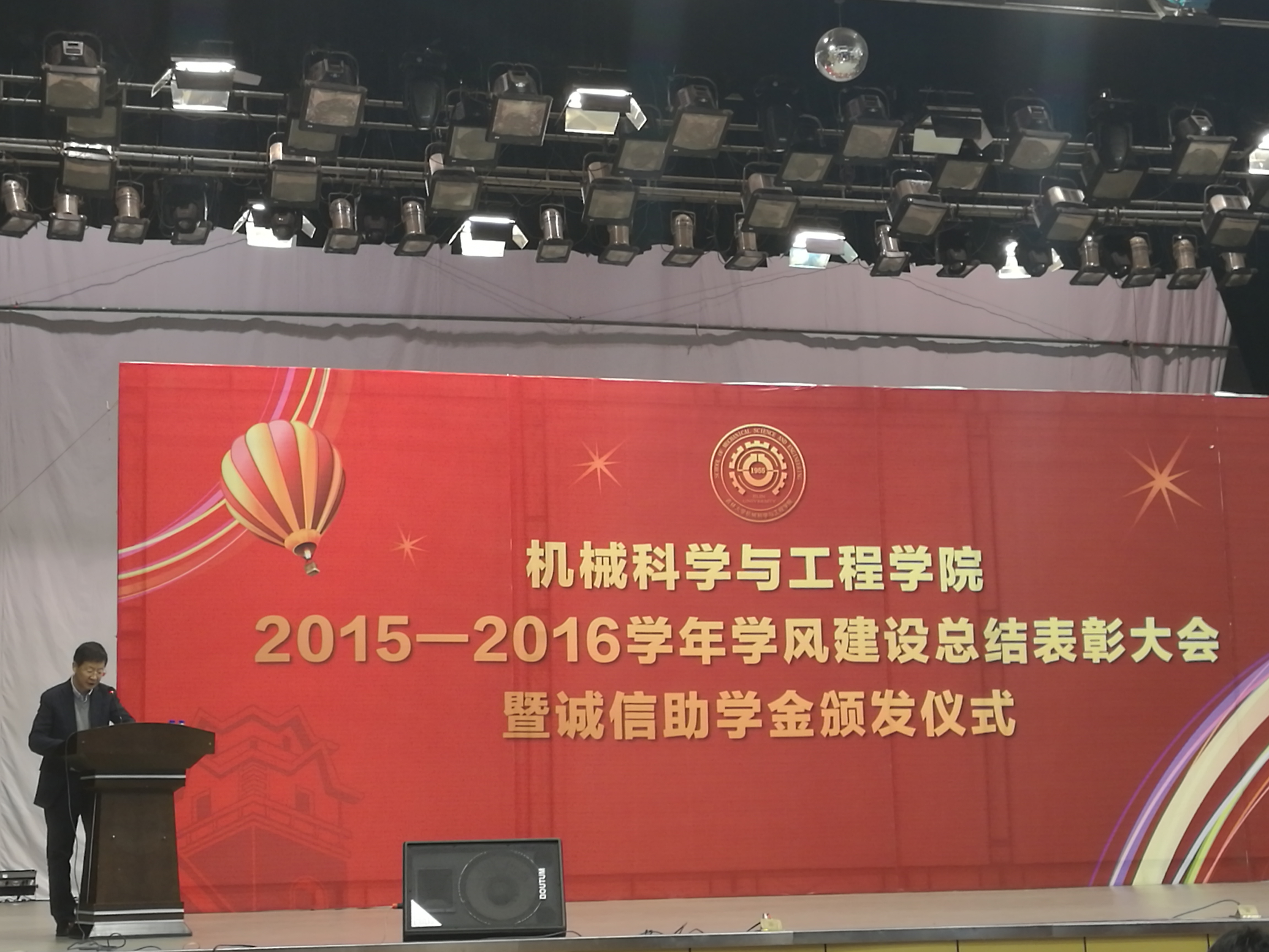 为调动广大师生的积极性,推进我院学风建设的进一步发展,推动学院人才培养、科学研究水平的进一步提高,12月21日13时,机械学院在南岭校区文化活动中心召开2015—2016学年度学风建设总结表彰大会暨诚信助学金颁发仪式。 机械科学与工程学院院长杨兆军、吉林大学教务处副处长王瑞、东区教务办公室主任王利军、东区学生办公室主任马艳秋、学校督学周作伸、高秀华,以及机械科学与工程学院副院长赵宏伟、周晓勤等领导和嘉宾出席大会。参加大会的还有各位班主任、辅导员老师以及机械学院全体在校本科生。会议由机械学院党委副书记兼副院长郑福胜主持。 在庄严肃穆的国歌声中大会正式开始。会上,副院长周晓勤做本学年度学风建设工作总结报告。他在报告中指出:学风是学院教育质量和管理水平的重要标志,是学院的立足之本,也是教师的治学态度和大学生学习目的、学习态度、学习方法和学习纪律等综合风貌的集中体现。通过大家的不懈努力,学院在文化氛围、教师风范和学习风气等方面显著提升,但仍存在一些不足需要积极改进,要继续加强学风建设力度以及人才培养力度。 机械学院副院长赵宏伟宣读表彰决定,东区学生工作办公室主任马艳秋宣读“诚信助学金”受资助学生名单。莅临大会的各位领导和嘉宾分别为学习标兵、志愿服务标兵、社会实践标兵、科技创新标兵、最佳班长、单科优胜奖获得者、学习进步奖获得者、文体活动突出贡献奖获得者、优胜班级、阳光寝室等获奖个人和集体颁发荣誉证书,学院院长杨兆军为“诚信助学金”受助学生颁发资助证书。 2013级冯少飞作为获奖学生代表发言,他结合自身学习、工作和生活经历,对学校和学院为学生们提供的锻炼机会和发展平台表示衷心感谢。 最后,学院院长杨兆军教授讲话,他指出:从学生的角度出发,学风建设的根本就是“努力学习、不打小抄”!希望全院师生能够积极进取、奋发向上,营造良好的学习氛围,为国家、为社会培养更多的优秀人才。杨院长的话语质朴亲和、发人深省。 召开学风建设总结表彰大会是建设优良学风、树立学生典型的一个重要环节,对营造积极向上的学习氛围、提高人才培养质量有着重大意义。机械科学与工程学院全体师生会继续不懈努力、超越自我、锐意进取、追求卓越,积极为学院的中心工作贡献自己的力量。