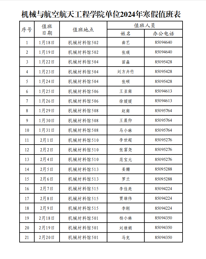 新葡的京集团8814单位2024年寒假值班表