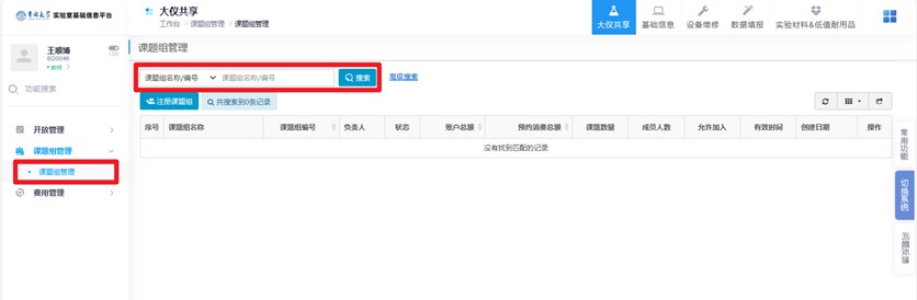 2.点击课题组管理,搜索课题组名称,如果未找到课题组,则需注册课题组。