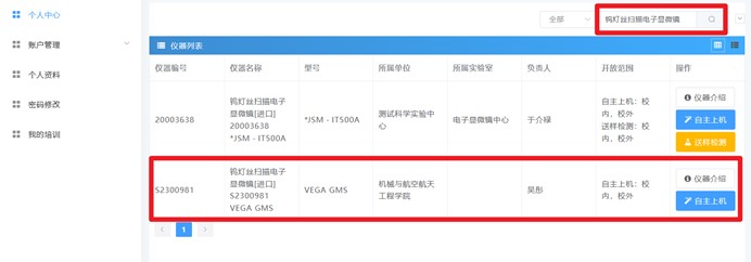 3.在搜索框中搜索需要用到的设备,这里以钨灯丝扫描电子显微镜第二项VEGA GMS为例,选择自主上机。