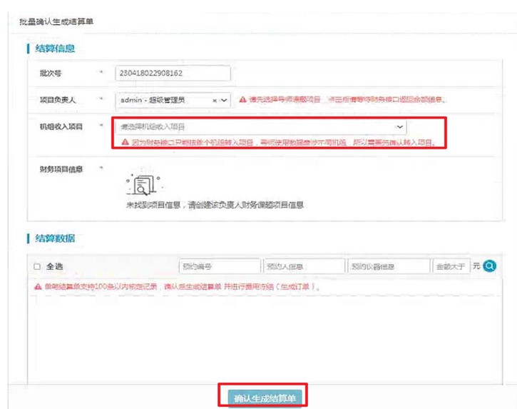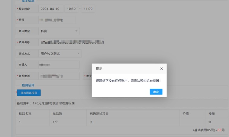 注意:基本信息中的导师信息填写时,如果导师没有申请自己的课题组并添加相应的付款项目,而在项目名称栏中手动填写项目名称,在点击立即提交后,会出现以下提示。因此,在预约电镜前需要用指导教师账号申请课题组并添加相应的项目名称。相应流程见补充操作1。