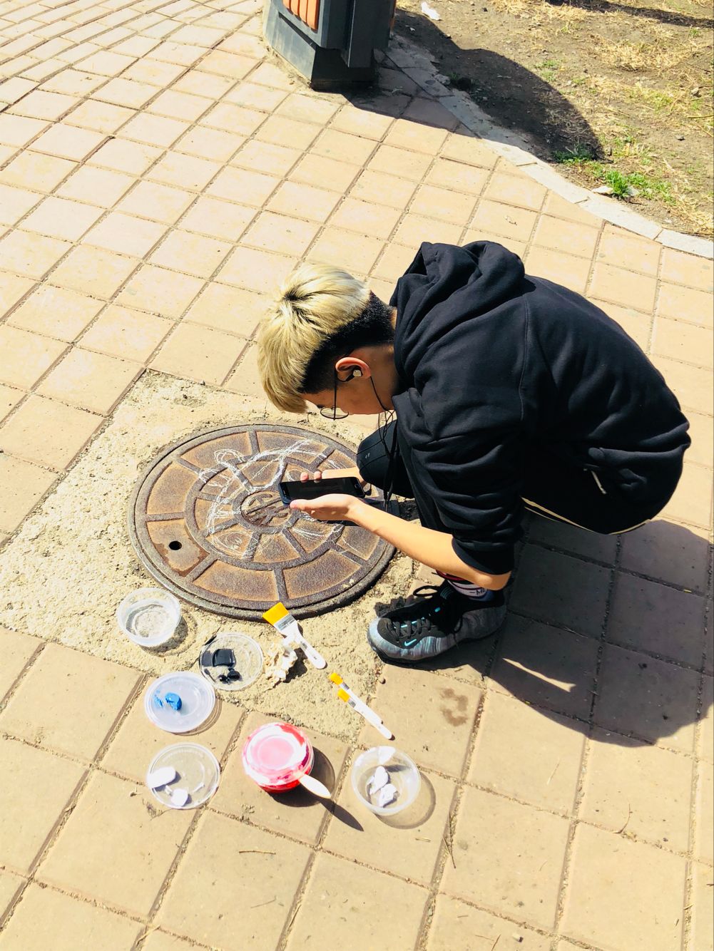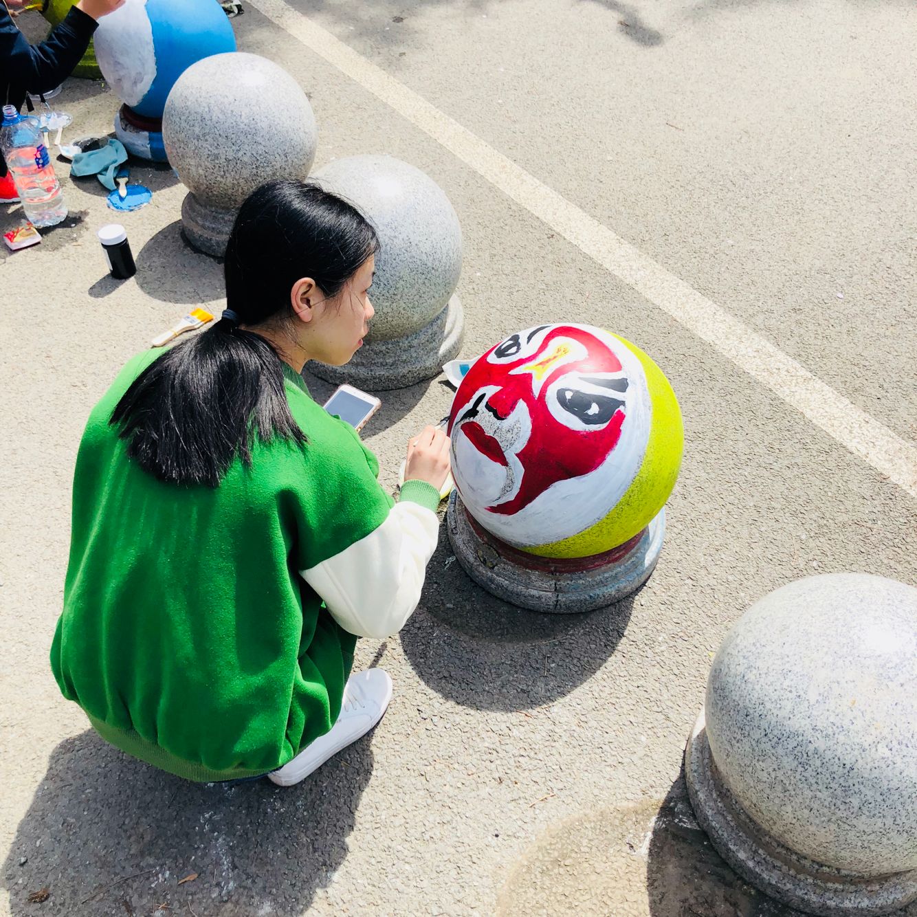 活动举办前,举办方在吉林大学机械学院的微信公众号、官方微博等渠道向爱好者发出了活动邀请,同学们踊跃报名参加。22日上午8时30分,活动参与者于逸夫楼二楼大厅集合,组织者向同学们简单讲解了活动事宜。22日上午及下午,同学们在南岭校区仿生楼前、逸夫楼前等多地对附近的井盖和石墩进行了彩绘。在峰昀刀画协会成员的指导下,同学们调制好颜料,先用粉笔勾勒线条,再用颜料填涂,绘制了一幅幅活泼生动的图案。这些图案中既有黑猫警长、海绵宝宝等一些家喻户晓的动画角色,又有各式各样的脸谱形象,富有创意又体现了文化传承,妆点了美丽的校园。