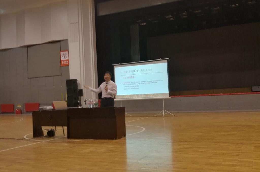 首先,于教授对到场的2018级新生表达了热烈的欢迎。随后,于教授从中美关系发展史的三个二十年说起,分析至由特朗普执政时期不太乐观的中美局势。于教授由历史引入当下,他指出,当下的中美竞争主要是实力竞争、规则竞争、领导权竞争与贸易战竞争,然而我国并不占优势,美国政府种种的对华政策一直在干预我国高速崛起,同时我国仍不是世界强国,依旧无法与美国正面打贸易战。于教授的一番话警醒了每一位新生,他们身上背负的不仅仅是个人与家庭的责任,更多的是国家振兴之责任。同时,于教授分析了当下贸易战的趋势,并为大家讲解中国的应对方法。于教授强调,中国人口基数大,人均GDP低,面对与美国的贸易战,我们应持中偏防,暂时忍受,同时加速发展国家硬实力。大学生是国家发展的中坚力量,每一位大学生都应该发挥自身价值,肩负起推动国家发展的光荣使命。会终,于教授为大家答疑,使大家进一步明确了作为大学生应担起的责任。