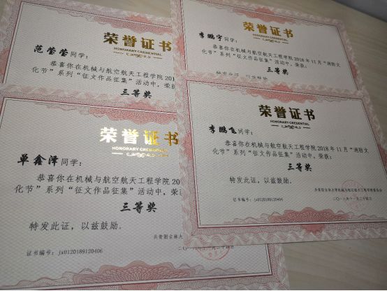 本次征文活动结合消防文化节的契机,得到了同学们的积极参与,通过维权管理部成员们的精心筛选,最终共有21份作品进入评比阶段。11月27日,经过最终审核确认,来自2018级机械9班的沈郭祥同学获得本次征文大赛一等奖,另有付梦强、王彬同学获得二等奖;李鹏飞、李鹏宇、单鑫泽、范莹莹同学获得三等奖。维权管理部对获奖同学表达了祝贺,并为他们颁发了奖状和奖品,本次征文活动也到此圆满结束。