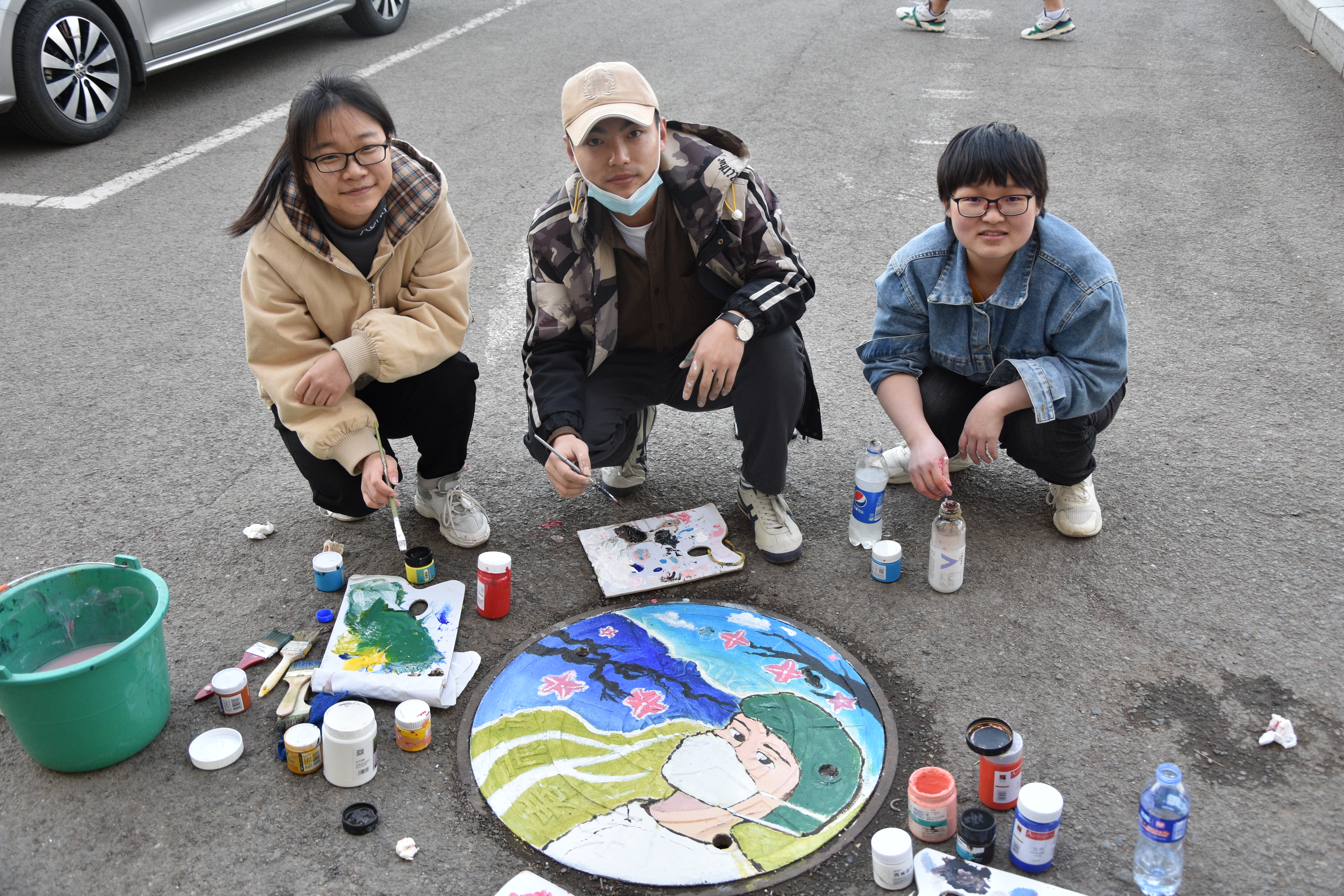 上午9点,活动正式开始。信息管理中心的工作人员们为参与人员分发绘画所需的各种工具与材料,同时峰昀画社的同学们给大家进行了简单的培训。同学们热情高涨,积极投入其中,擦洗井盖,发挥想象,设计图案,同学们将自己的创意呈现为一幅幅井上画作:有可爱的卡通动漫,美丽的风景画,还有歌颂抗疫医生的时代主题画…