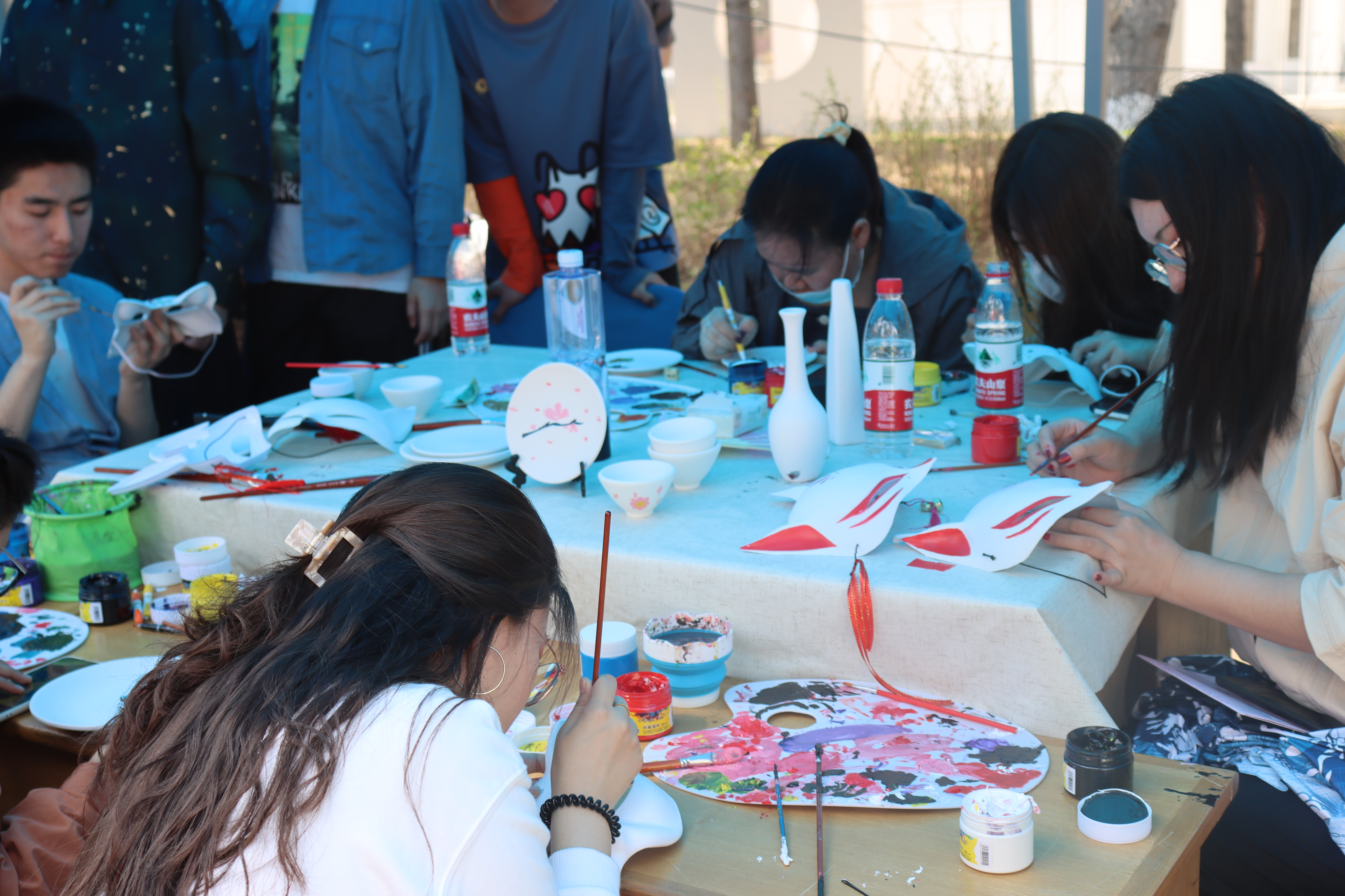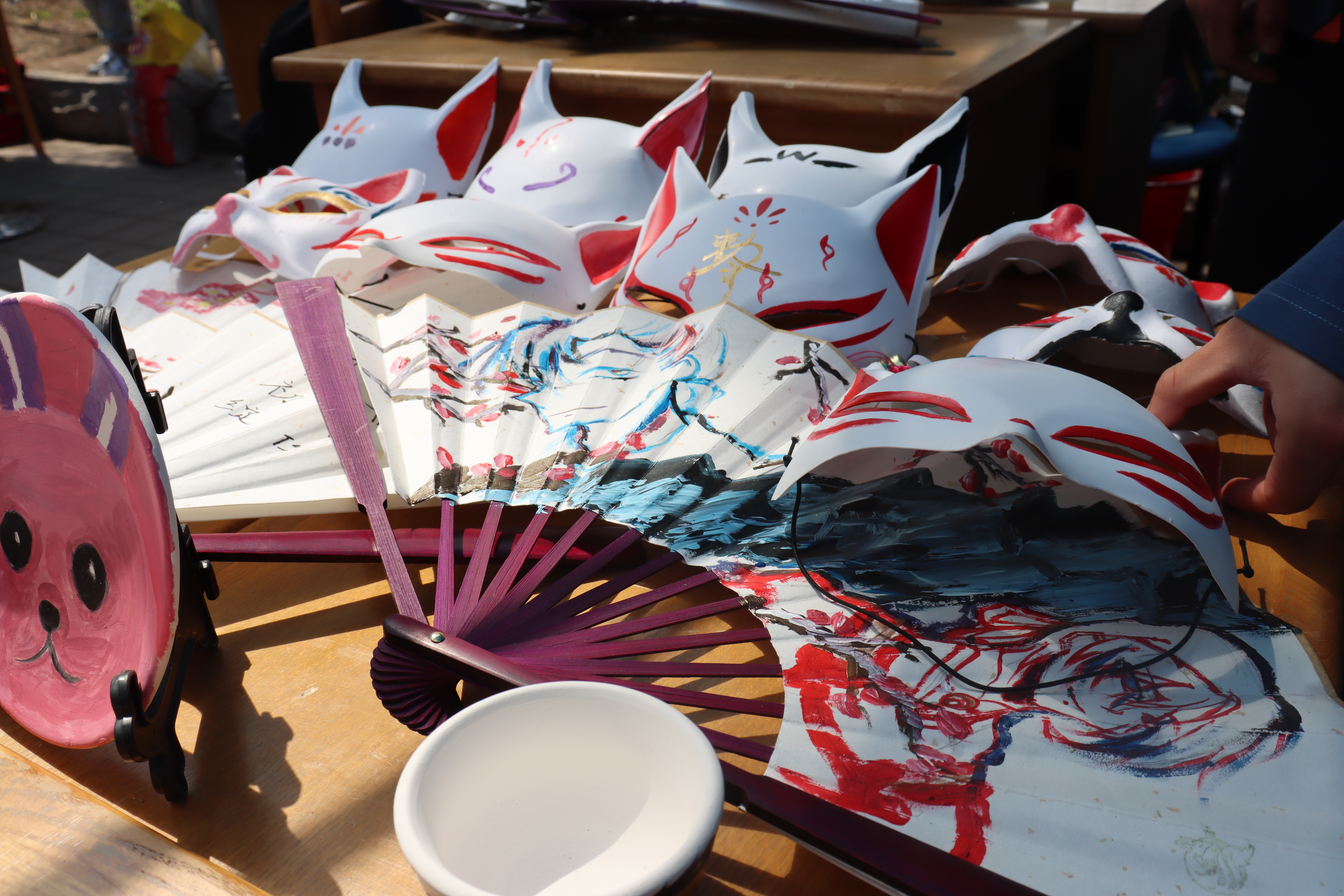 参与者在完成简易的色彩挑战游戏之后,便可参与活动,完成创作。不论是为不同风格的半成品面具进行个性创作,还是在不同形状的素胚陶器上进行创意彩绘,又或是在素面的古风折扇上进行书法、绘画创作,参与者都将想象力和个人特色融合进了作品中。同时工作人员也在旁指导参与者,为参与者提供绘画元素,在这种沉浸式的文化创作体验中,参与者深切的体验了独特而浓厚的杏花文化。同时优秀的作品也被精心布置在展示区,精美的杏花瓷瓶,精致的杏花面具,惊艳的杏花折扇都静静地陈列在一旁,吸引无数游客围观驻足。更值得一提的是,独特的摊位文化有幸吸引了央视新闻的记者前来采访,在央视直播的镜头下,色彩与杏花文化的碰撞被传播出去。