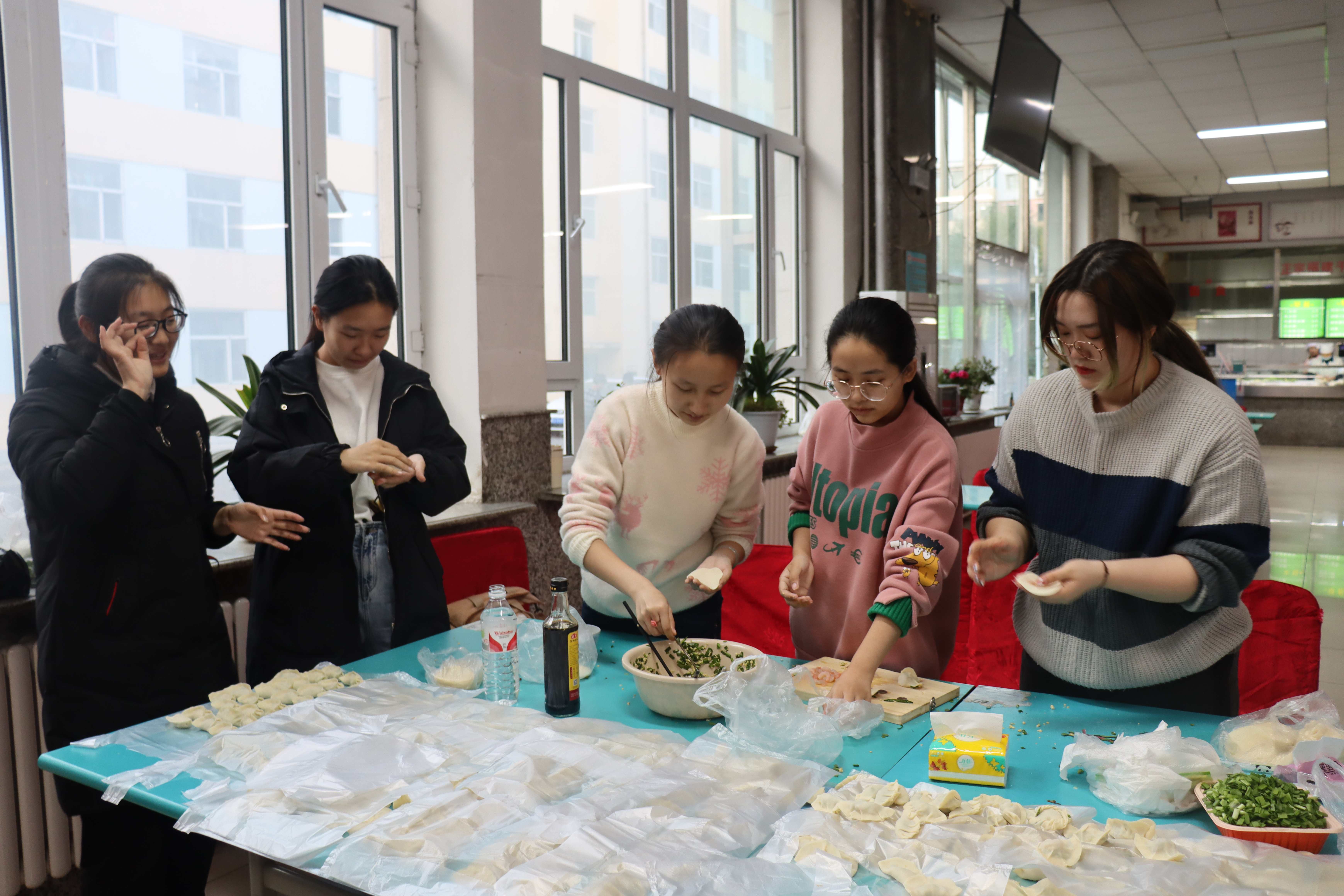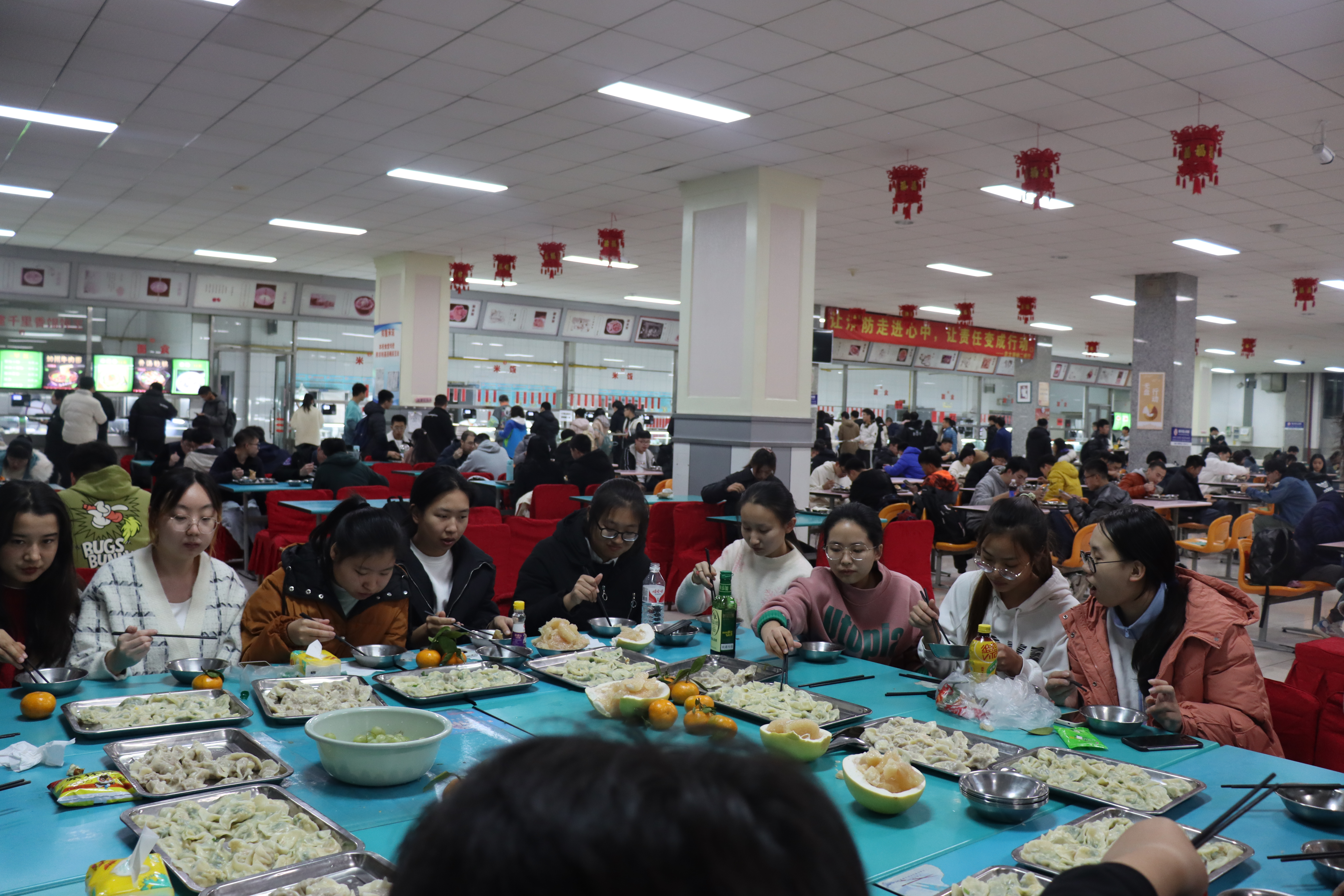 按照女生节的传统,各学院的班级都纷纷在十二公寓楼下拉起横幅,诉说对女生们的赞美与祝福。红色的横幅与皑皑白雪交相呼应,平添了一丝热烈的氛围。“春风十里,不如有你”,“寻遍南岭百花院,机械女神压群艳”……横幅文案或引用诗词,或天马行空,抖包袱,写段子,无所不用其极。为搏女神们一笑,男生们可谓费尽心机。欣赏品鉴新出炉的横幅也是一大乐趣。横幅在风中招展,温暖与关怀随风传遍南岭的冬日。身处东北,逢年过节都要吃饺子。女生节也不例外。在寒冷的冬日里,二餐一楼出现了一群俏丽忙碌的身影,这便是机械学院的女孩子们化身厨房小能手,在一起包饺子。刚出锅的饺子摆上餐桌,氤氲的水汽与窗外的白雪烘托出了节日氛围。大家围坐一起,仿佛置身除夕夜的年夜饭桌。更加值得一提的是今年的创新活动——“心愿墙,大转盘”。在浪漫的初雪里,在二餐的门口前,机械学院开辟出一方小空间,推出一面心愿墙,摆起一个大转盘,等着路过的行人,写下心愿,揭下心愿。让奇妙的缘分在心愿转盘上传递。