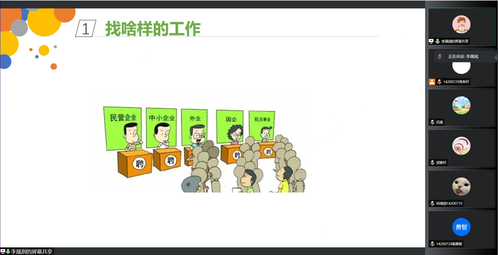 会议开始后,两位分享人依次进行发言。首先是田莫同学,在读期间获得吉林大学多项个人奖、团体奖、奖学金,在校期间成绩位于专业前30%。并且,曾在国家级大创项目中申请发明一项、实用新型专利一项,发表论文《一种仿生扑翼飞行器》,毕业后入职华为,担任客户经理。田莫根据自己成功就业的经历,从信息获取、简历、面试、实习等几个关键方向告诉大家要就业就要做好充分的准备,分享了众多技巧与个人心得,干货满满。随后,李晟润也进行了分享,在其本科学习四年中,多次荣获奖学金、优秀学生、优秀团员、优秀学生干部等奖项,同时,在读期间参与编写SCI论文,获得美国大学生数学建模竞赛H奖。毕业后就业于一汽大众营销岗位。作为拥有如此优异光鲜履历的一位毕业生,李晟润关于努力学习、丰富专业知识的分享生动地打动了参会者。他强调专业知识、专业能力很重要,过去的优异成绩会是很棒的敲门砖。
