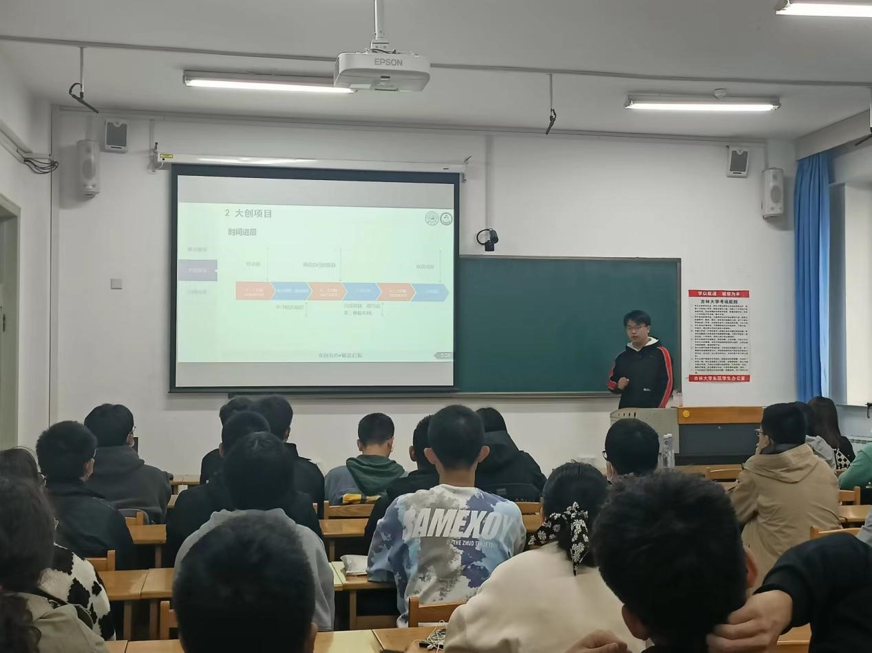 活动开始,孙慧超老师将大学生创新创业训练计划的具体要求、参与途径、资助方法以及近年来取得优秀成果等方面做了详细介绍,他鼓励学生积极参与实践创新活动,在实践中大胆思索、勇于创新。接下来,获得2022年度吉林大学“大学生创新创业训练计划”国家级结题项目的游琳敬、李佳霖两位同学,结合自身实践经历为同学们作参赛经验分享。他们从前期准备、研究中遇到的困难、解决方案以及心得体会等方面和大家进行了深入交流。最后,在现场提问环节中,孙慧超老师及两位同学针对同学们提出的问题进行详细解答,现场气氛热烈,参与学生纷纷表示获益匪浅