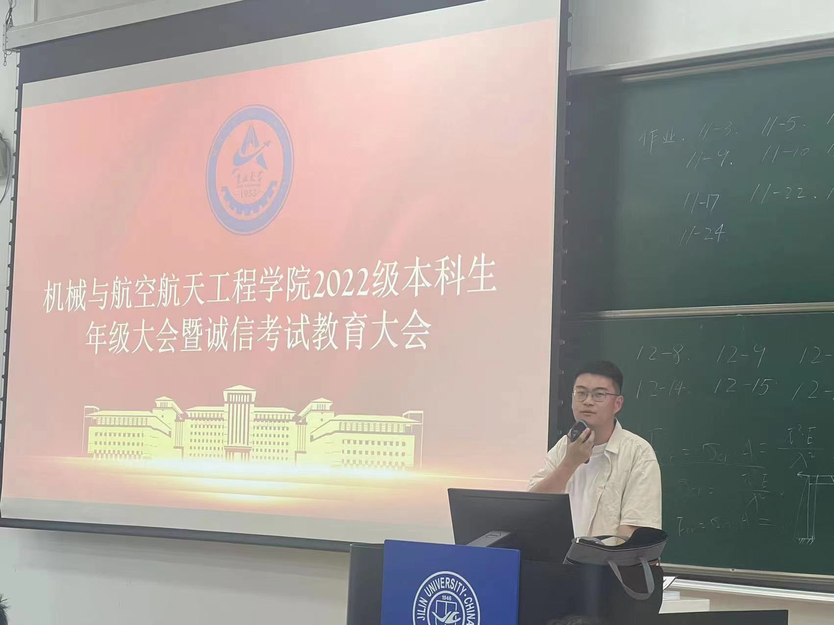 为帮助我院2022级本科生明确大学学业规划,树立正确的学习目标,同时加强本科生日常管理工作,严肃考试纪律,树立优良学风,我院于2023年6月8日晚18:00在南岭校区逸夫教育大楼B211室召开2022级本科生春季学期年级大会暨诚信考试教育大会。2022级本科生辅导员张富尧老师、2022级本科生全体同学参加本次会议。