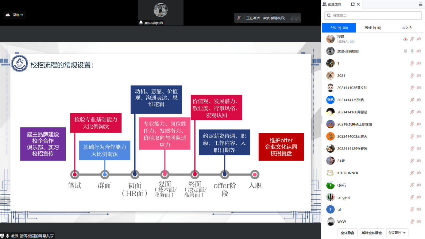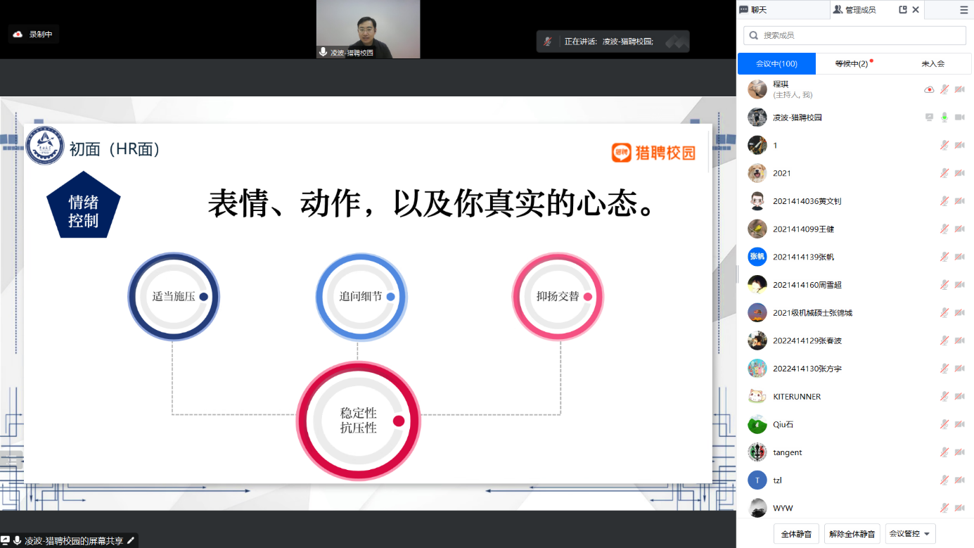 本期分享会邀请了猎聘校园–高校关系总监凌波为大家分享就业经验。凌波,猎聘校园–高校关系总监,复旦、南大、哈工大、南开、北航、北工大等高校就业指导活动校外讲师;教育部24365联合招聘活动猎聘方发起人;人社部湖北高校毕业生就业指导特约讲师。曾负责众多企业校园招聘落地工作,参与策划全国大学生最佳雇主评选活动,多次牵头举办公益活动。本次会议凌波老师从第三方更专业的角度为大家分享各阶段面试差异与表现技巧。