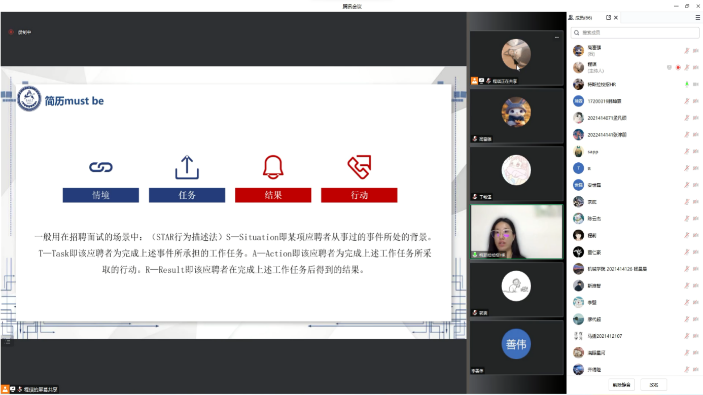 会议上,殷惟馨对分享内容进行了简要的概述,她分别从优化简历的原因、方法等方面为同学们讲解。殷惟馨对简历的每一部分进行相应的分级,强调了简历必须简单有力、突出重点能力,能力并非越多越好,重点是让HR看到求职者与应聘岗位的匹配度。对于如何如优化简历,殷惟馨将以往的招聘简历作为案例为大家分析其中的利弊,个人信息、项目经历、项目分层以及数据支撑等等。最后进行了现场改简历环节,同学们响应激烈,殷惟馨对同学们提供的简历都提出了相应的修改建议,并对同学们提出的问题进行了详细解答。