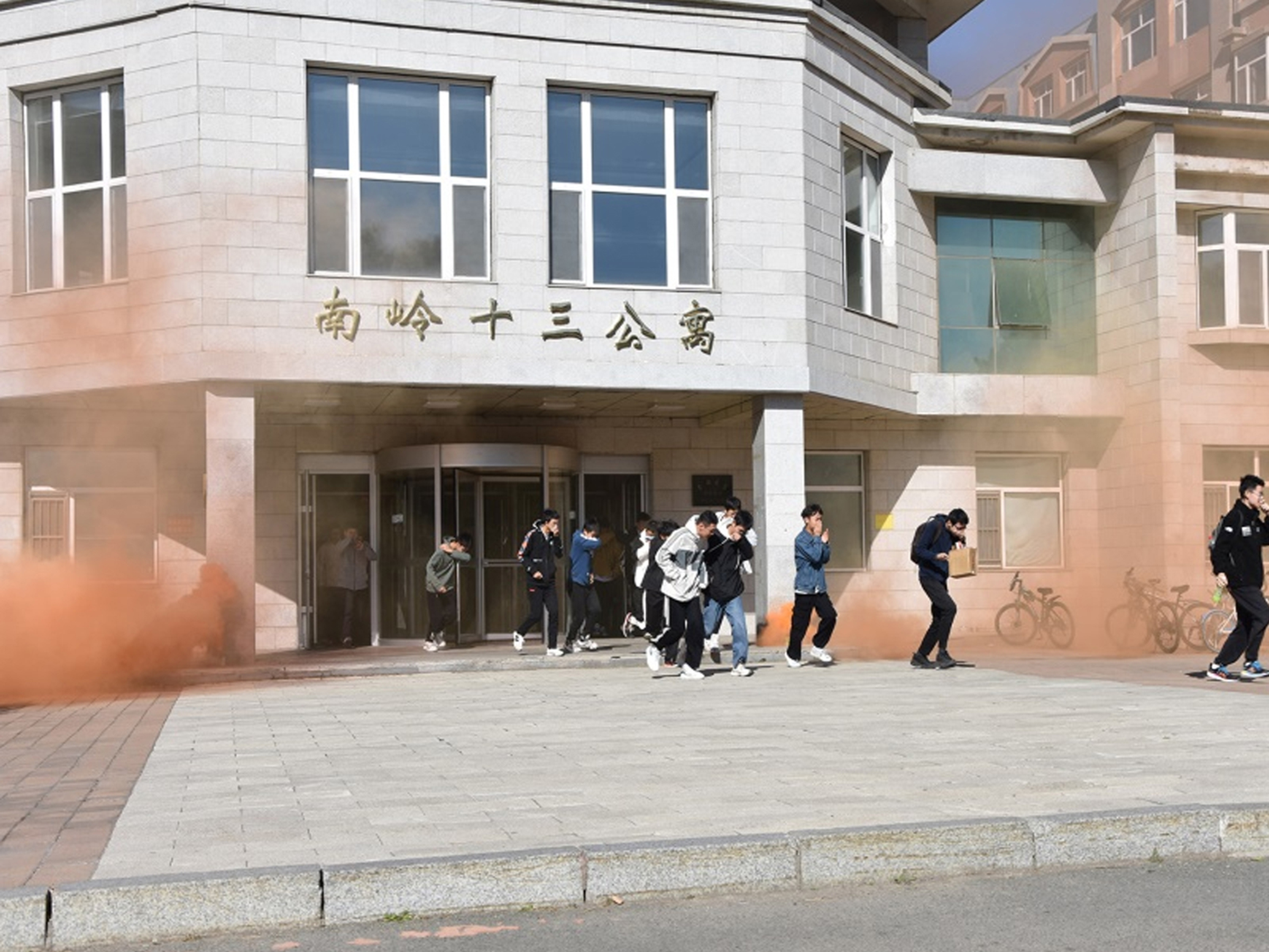 演练分为疏散演练和灭火演练。首先由保卫部门在公寓门前释放烟雾器,公寓值班人员按下手动报警器,所有安全出口在第一时间打开。学生根据以往了解的最佳逃生路线和出口位置,按现场实际情况进行应急处理,以最快速度疏散至安全地带。