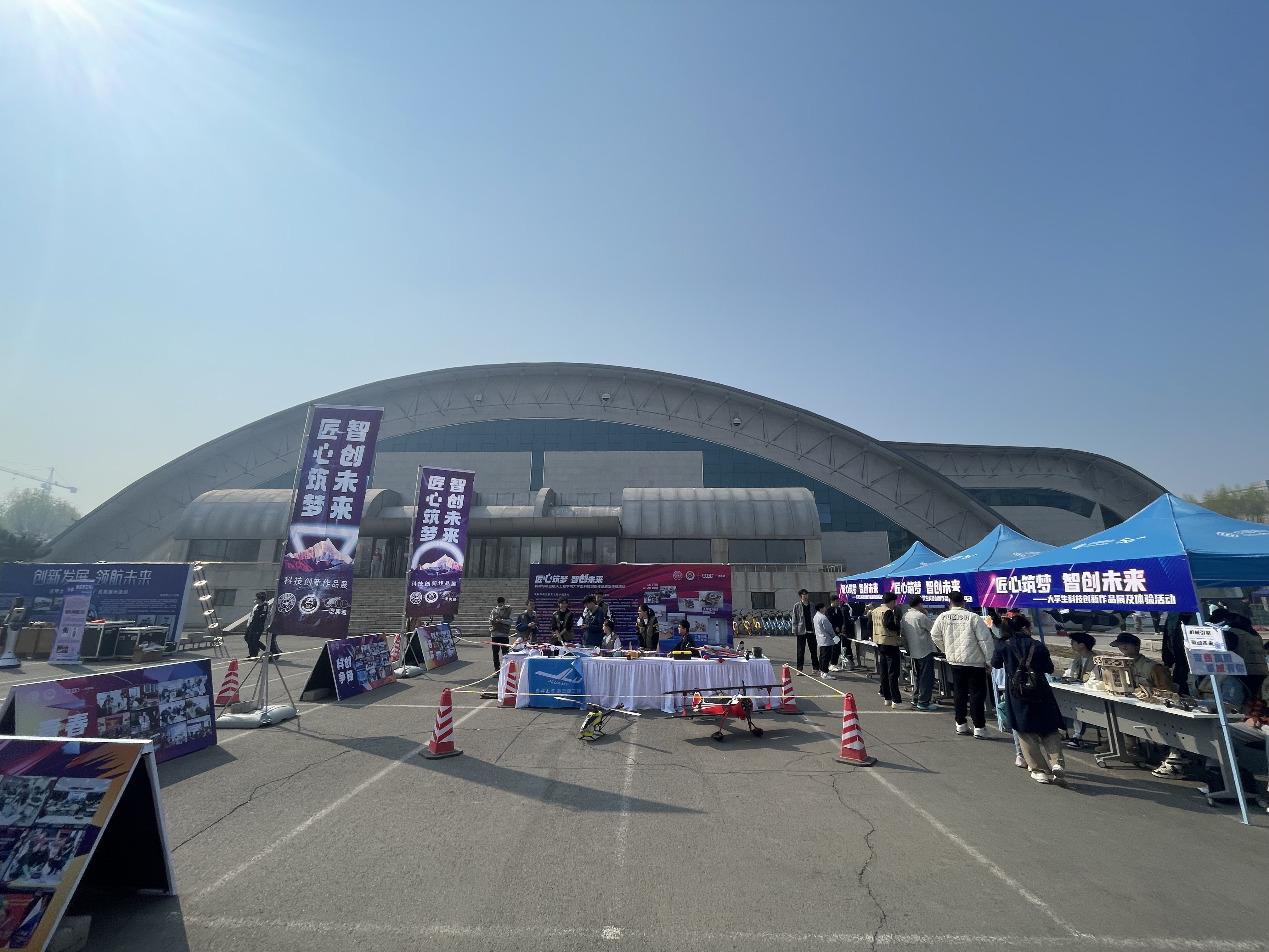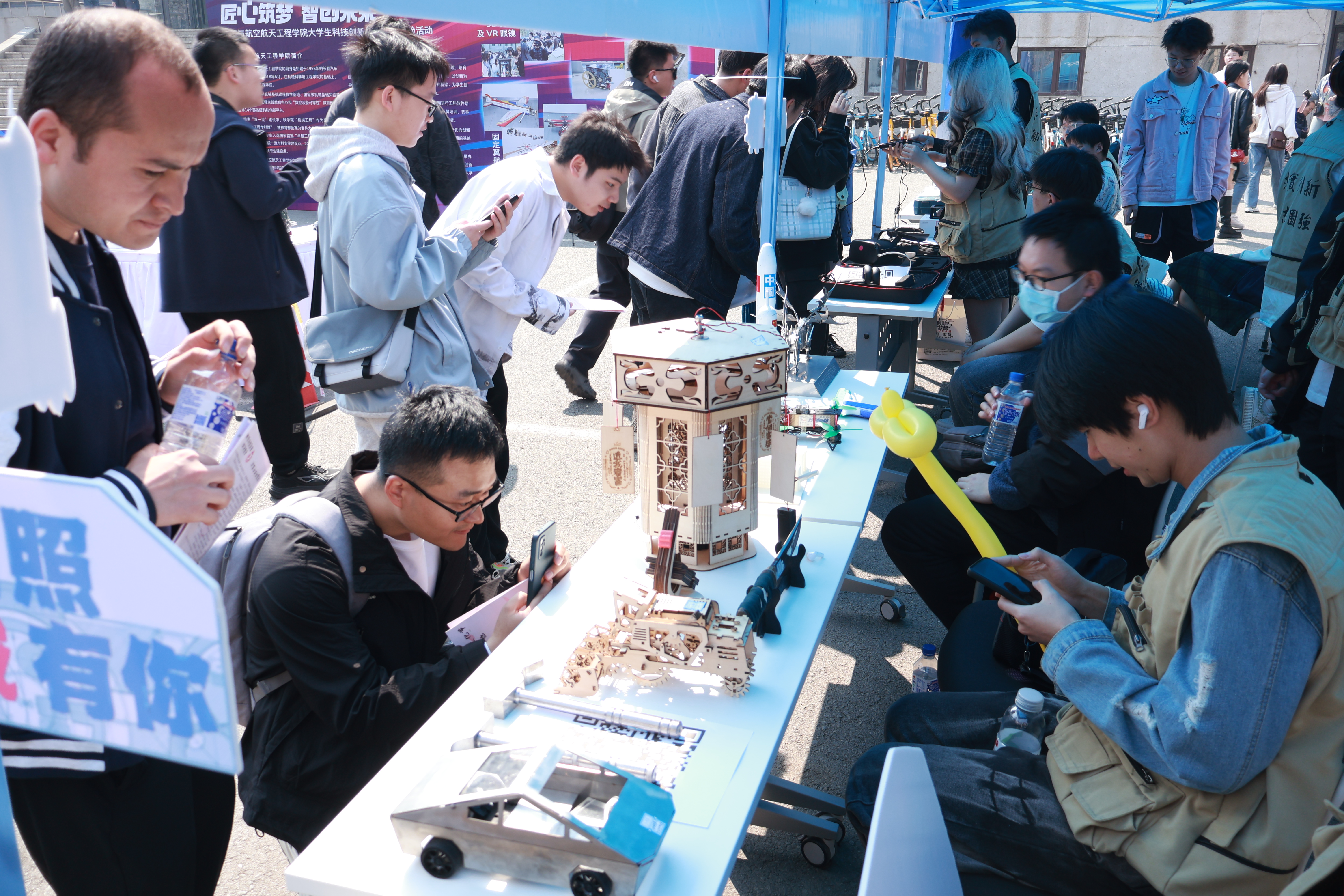 科技实践作品展示区品类多样,包含激光加工、线切割等工艺加工的作品,和学院航模队独立设计制作的固定翼航模作品。竞赛代表作品展示区展示了我院学生在工程训练大赛和机器人对抗竞赛中自主设计制作的势能车、格斗机器人等作品,吸引了大批校内师生和校外游客驻足打卡。