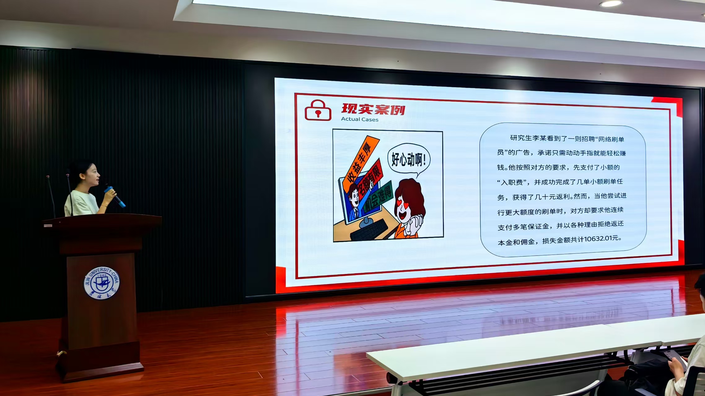 任子寒以“防范网络诈骗,安全教育常识”为主题,深入浅出地分析了当前网络安全面临的新形势、新技术新应用带来的新挑战,并结合具体案例和数据,向新生们普及了网络安全法律法规、个人信息保护、数据安全等方面的知识。她特别强调了设置复杂密码、定期更新软件、警惕网络钓鱼等实用的网络安全防护技巧,为大家提供了宝贵的防范建议。