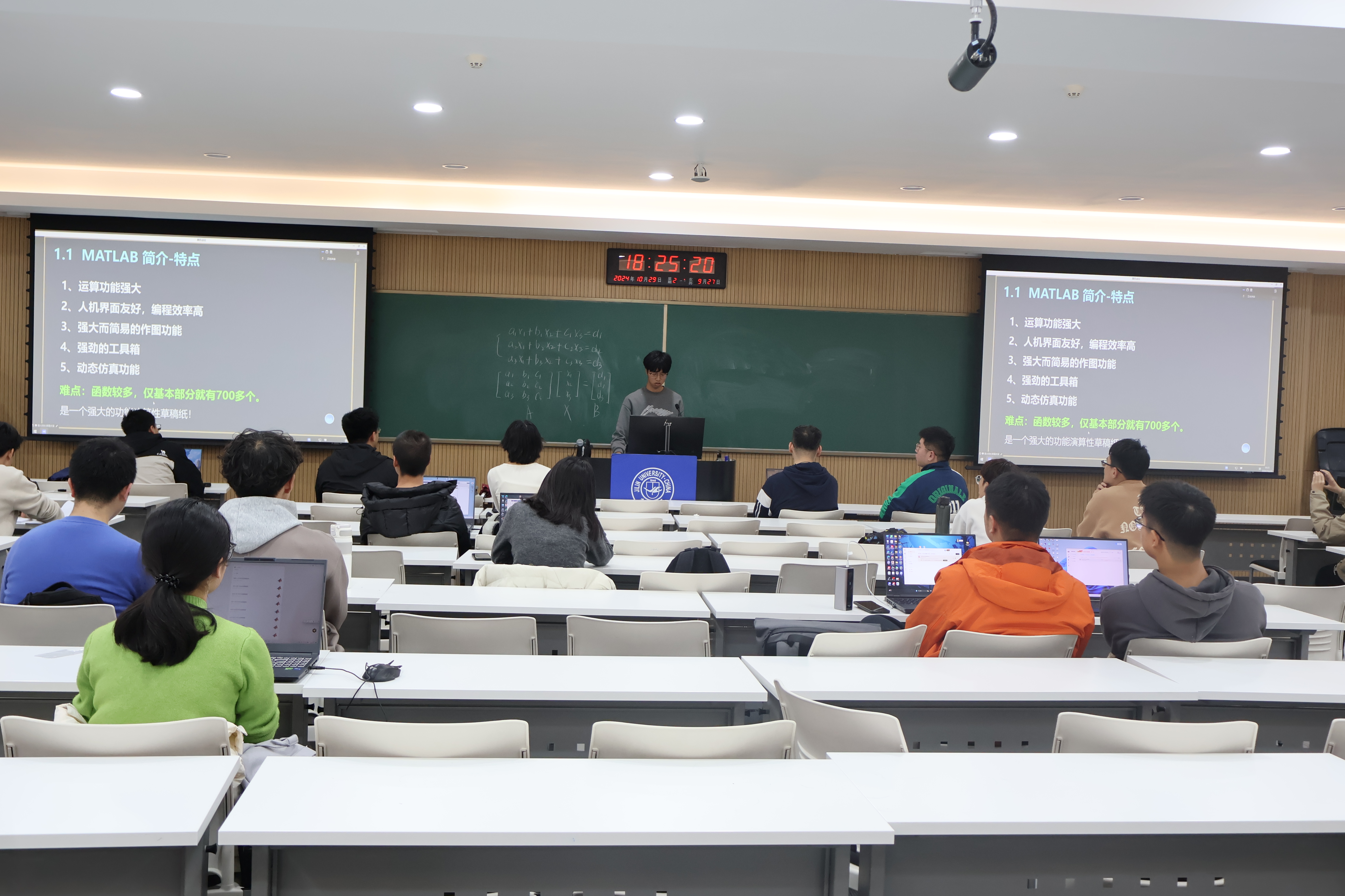 紧接着,栗允琦同学开始讲授本次培训内容,将MATLAB的数字计算,矩阵变换等功能一一呈现,为了让同学更好理解,栗允琦同学还准备了若干例题与同学分享,让同学们掌握基本操作后直抵问题核心。考虑到2024级同学的课程安排,栗允琦特地向同学普及简单的C语言与线性代数知识,使入门MATLAB不再吃力。在整个过程中,同学们踊跃提出问题,积极与主讲人互动,强化了所学的知识。栗允琦同学进行现场答疑解惑,确保让同学听得懂,跟得上。