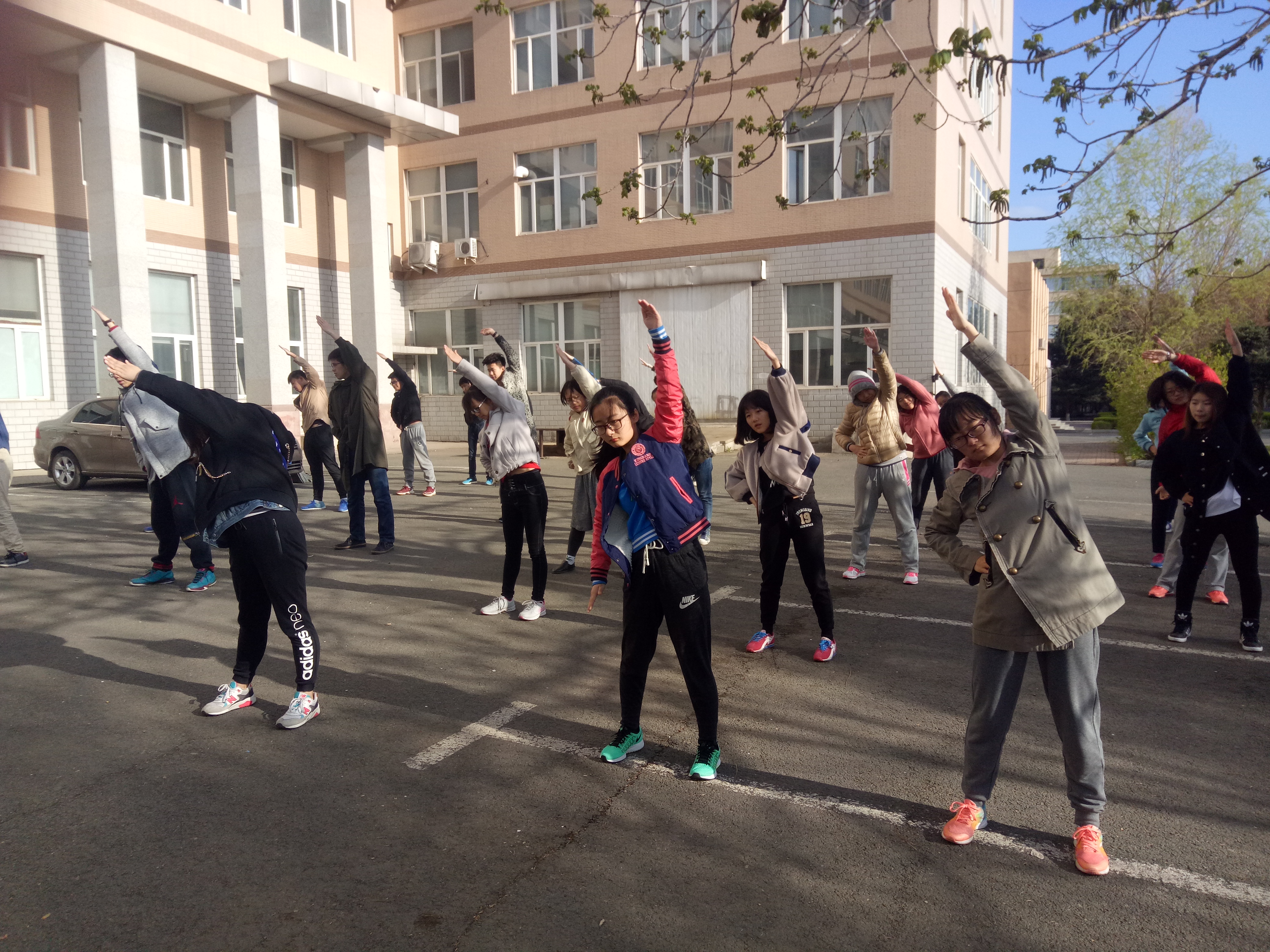 每天晚上9点15分,同学们准时在12公寓门前的空地上集合,各自签到后便按照队形有序站好,等待着健美操的训练。学生干部首先为同学们做动作讲解,为使同学们快速掌握每个动作的要领,他们会先给大家做示范,然后大家再跟着节拍进行练习。参与项目练习的同学都很积极地配合,不懂的地方会主动询问,对于健美操的动作更是一丝不苟。初春的夜晚依旧有些寒冷,但是同学们积极洋溢的激情却温暖了每个人的心田,学生干部们关切耐心的指导也使整个训练过程充满温馨。经过几天的动作练习,大家的整体水平有了显著提高。