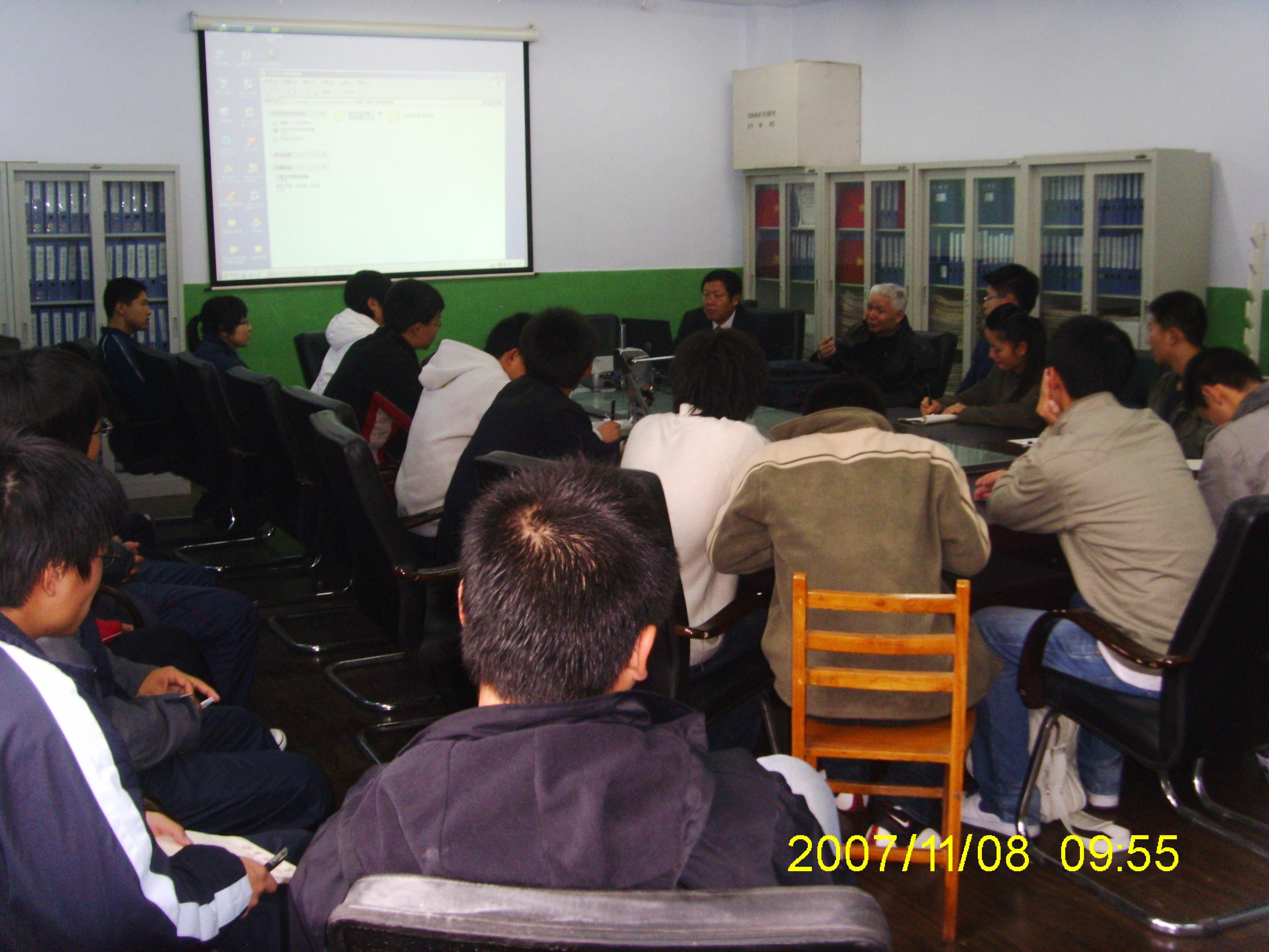 由于时间关系,孟广伟教授主要对同学们的疑问进行解答,很多同学不太明确大学的目的和方向,孟广伟教授说“大学四年是素质素养的培养,大学一是讲授知识,二是培养你怎样做人。”他准备了一些资料,利用投影仪为同学们放映了一部分,当同学们得知面前的这位陈塑寰教授曾发表过学术论文350多篇,其中SCI收录115篇,出版过专著6部时,无人不对这位再过几天就73岁高龄的老者肃然起敬!