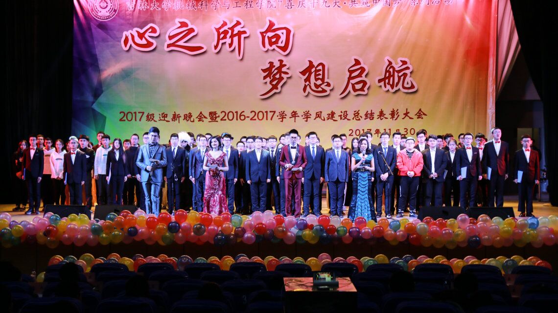 党的十九大描绘了新时代的宏伟蓝图,指明了前进方向,使广大师生深受鼓舞、倍感振奋。为了深入宣传十九大精神,让同学们牢记最初的梦想,充分展现学子风采,机械科学与工程学院“喜庆十九大,共筑中国梦”系列活动之2017级迎新晚会暨2016-2017学年学风建设总结表彰大会于11月30日晚6点在文化活动中心举办。南岭校区教务办公室主任周伟,机械科学与工程学院党委书记程钺、党委副书记王柏、党委副书记兼副院长郑福胜,副院长周晓勤、姚国凤、王继新、曲兴田,机械基础教学中心副主任寇尊权、学生工作办公室主任李佳亮、辅导员辛闯等参加此次活动。