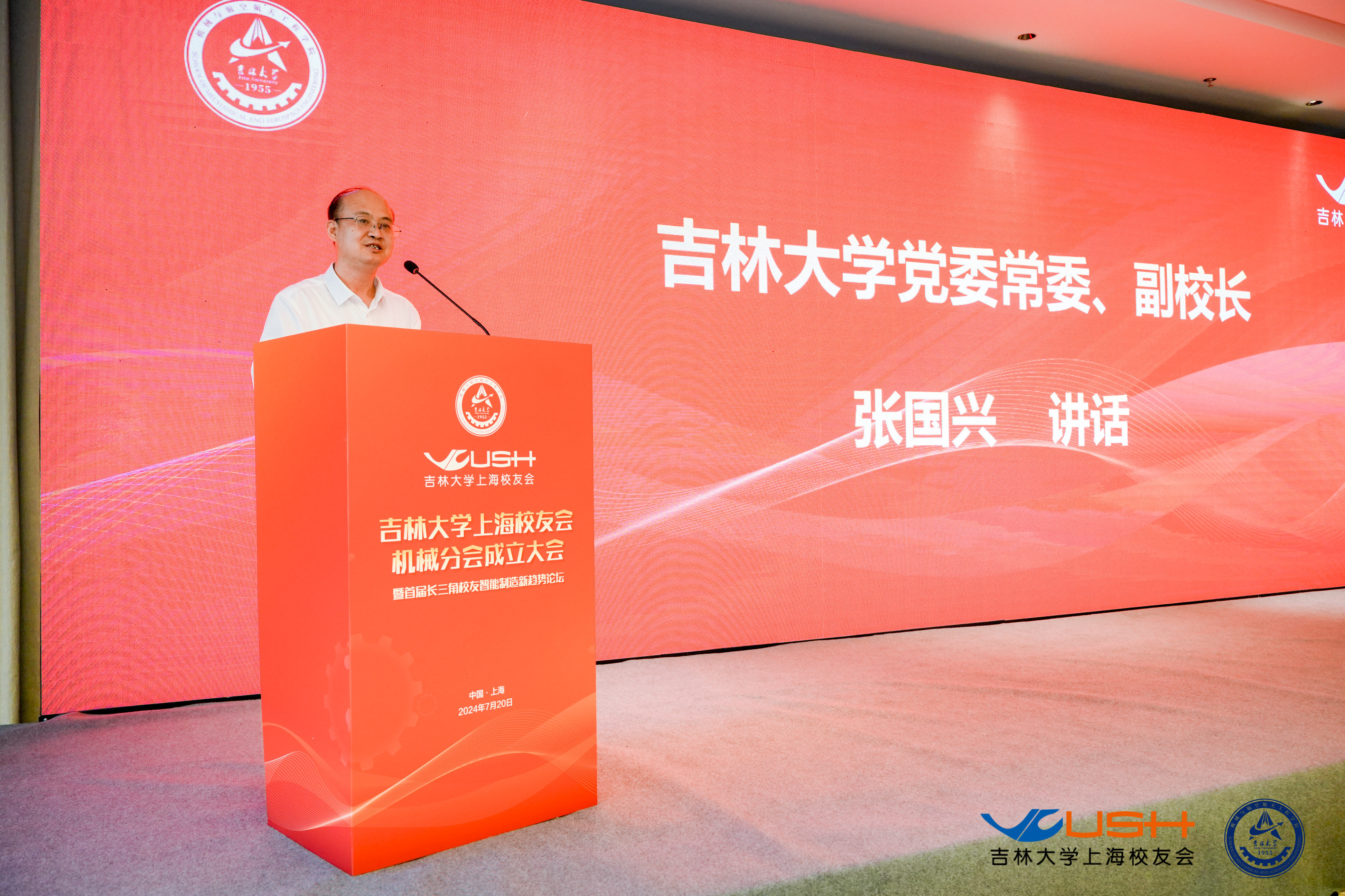 吉林大学党委常委、副校长张国兴在致辞中代表姜治莹书记、张希校长向上海校友会机械分会的成立表示衷心的祝贺,向多年来始终关心和支持学校发展的各位校友表示诚挚的感谢。他表示,学校各项事业的发展和取得的成绩,与校友们对母校的关心和支持密不可分,学校将始终把校友工作摆在更加突出的位置,持续优化举措,创新服务路径,不断汇聚起校友与母校共融发展、双向奔赴、携手奋进的磅礴力量和强大动能,在强国建设、民族复兴的新征程中展现吉林大学的新形象和新作为。