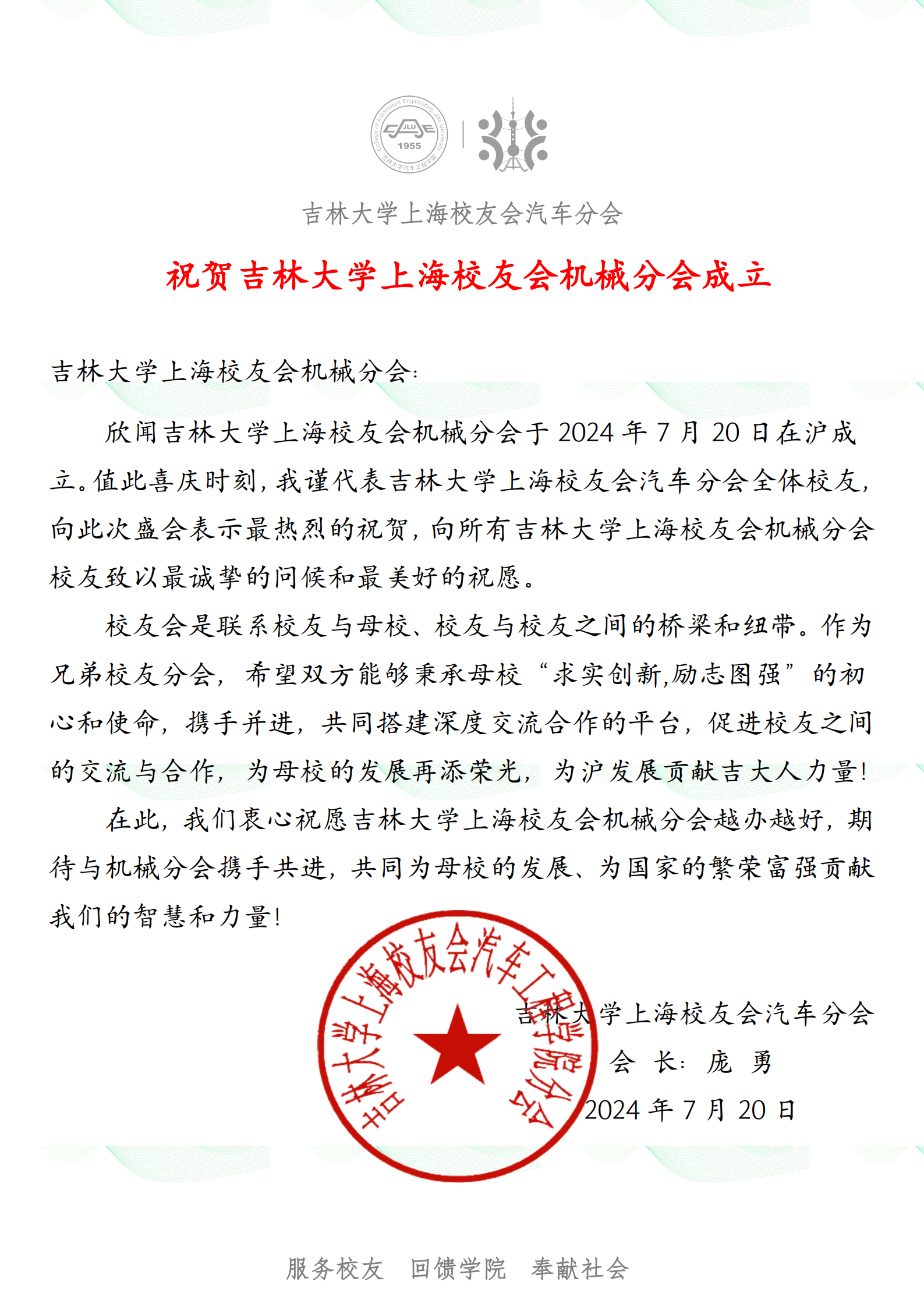 吉林大学重庆研究院执行院长赵敏、吉林大学上海校友会汽车分会会长庞湧分别代表兄弟城市校友会、上海校友会兄弟分会向上海校友会机械分会送上祝福,表达了兄弟校友会间同气连枝的深厚情谊,共同庆祝上海校友会机械分会的成立。天津校友会机械分会筹备组,上海校友会汽车分会、商学分会也分别送上了礼物和贺信。
