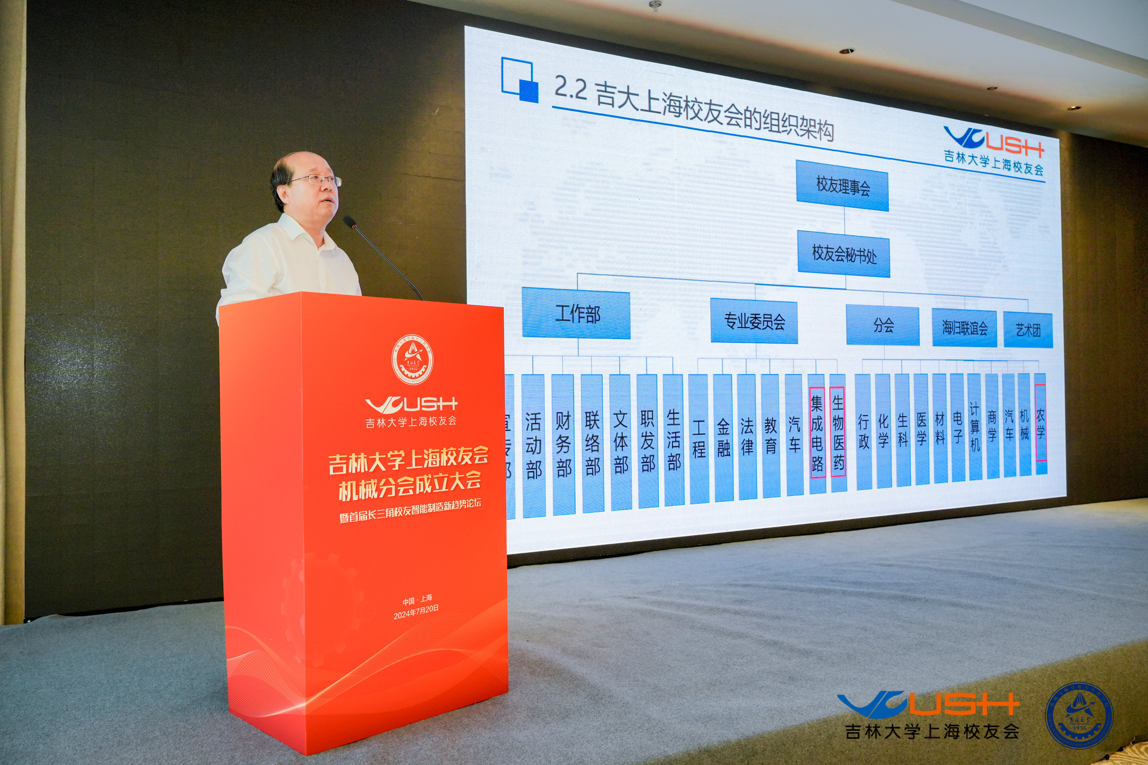 成立大会上,吉林大学上海校友会常务副会长兼秘书长王洪俊代表吉林大学上海校友会祝贺机械分会成立。他向与会嘉宾详细介绍了上海校友会的建设情况,并表示在今后的工作中上海校友会会给予机械分会大力支持,并努力促进校友会内部各分会之间的交流与合作。
