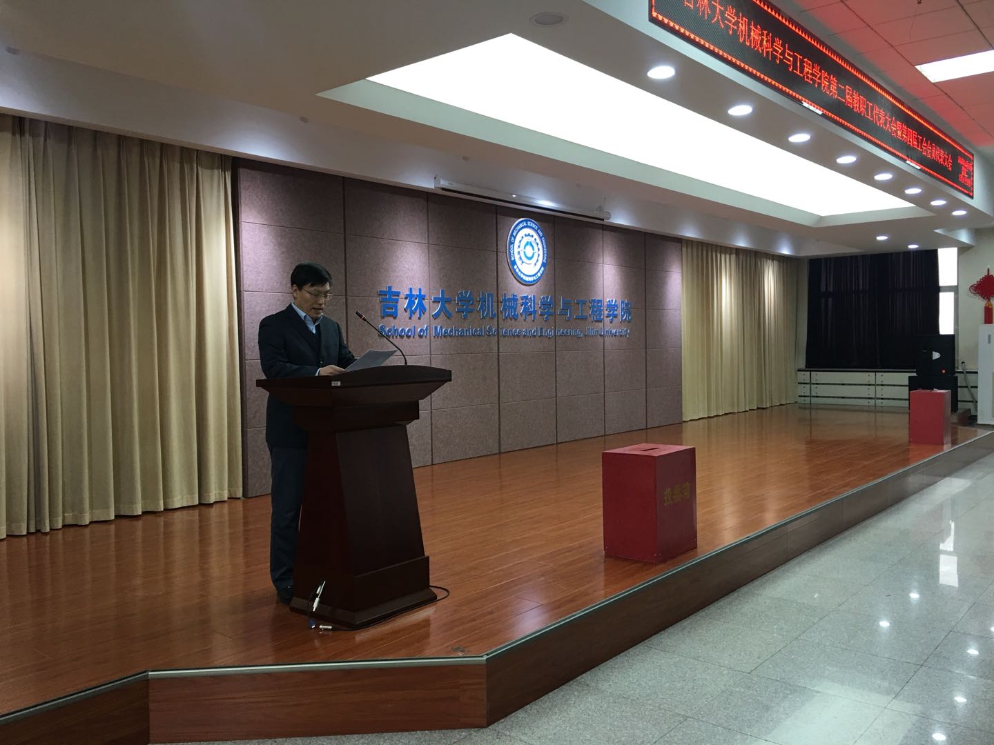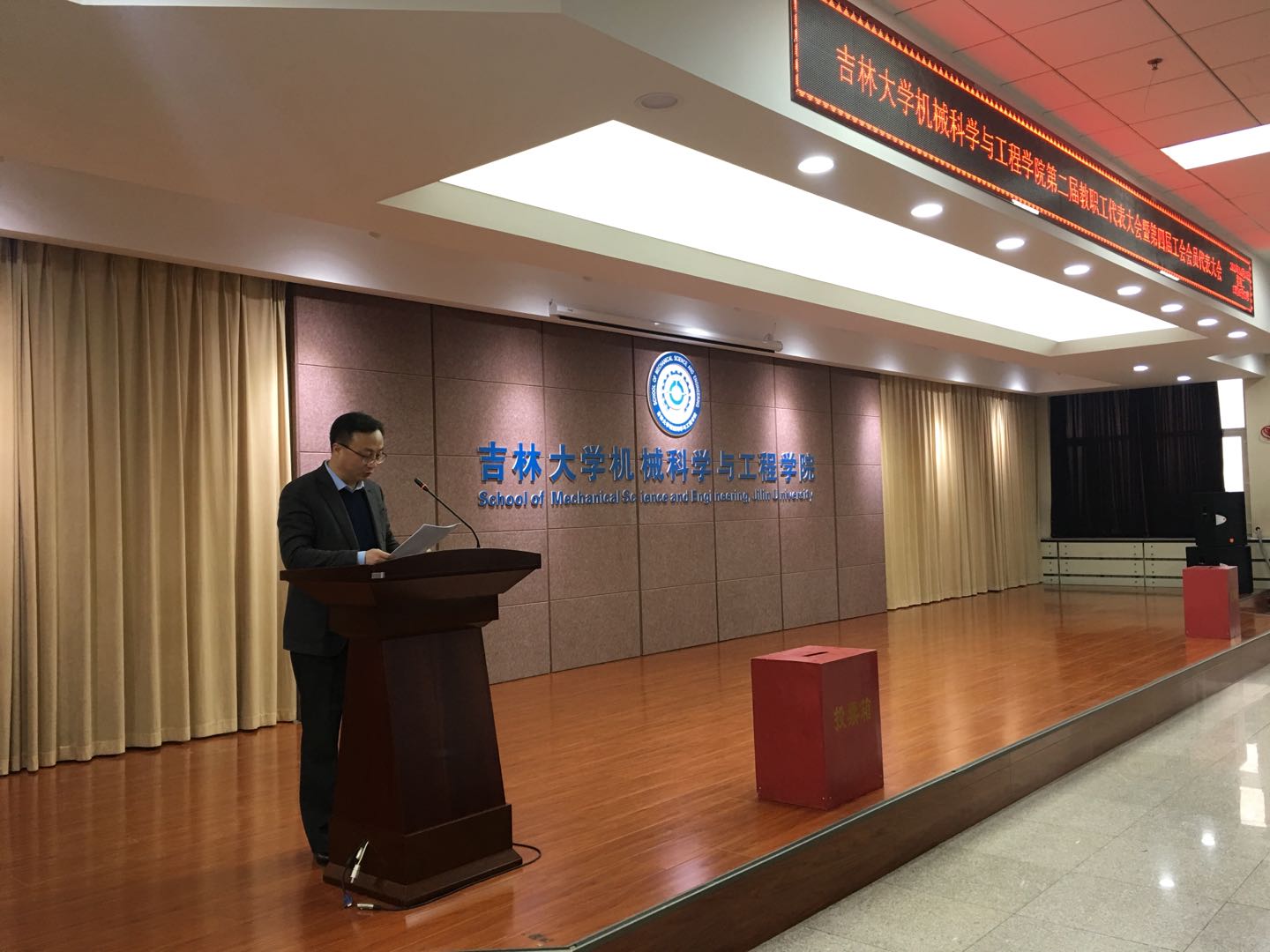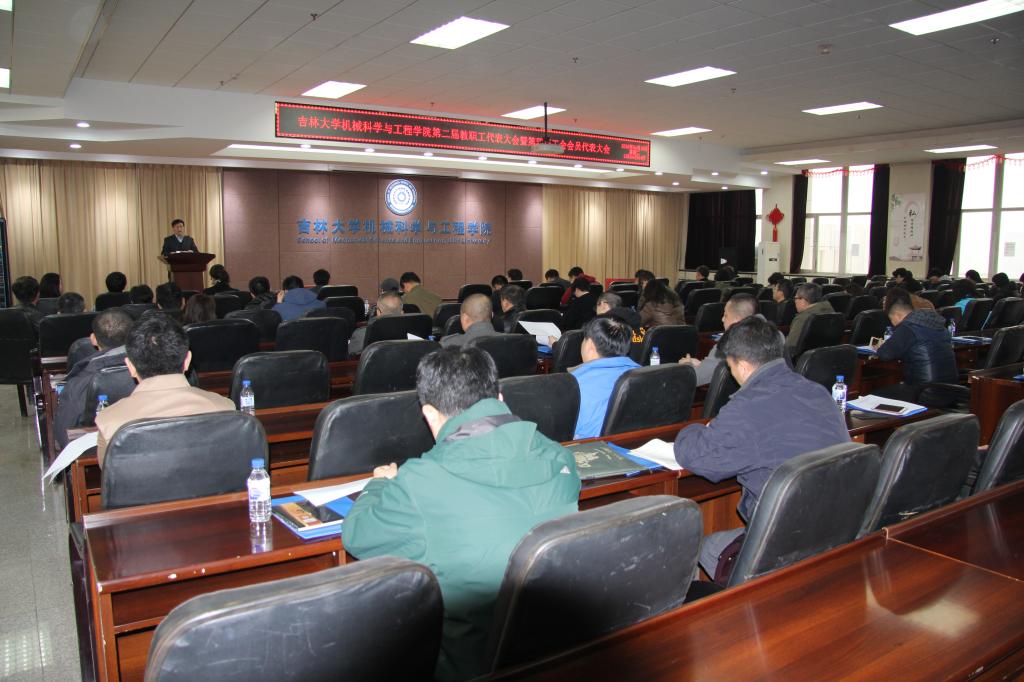 雄壮的国歌声后,由学院院长赵宏伟作学院工作报告,学院行政副院长、工会主席黄莹作学院教代会、工会工作报告。会议审议通过了《吉林大学机械科学与工程学院第二届教职工代表大会执行委员会委员暨第四届工会委员会委员和工会经费审查委员会委员选举办法》,根据选举办法,与会代表经无记名投票选举产生了机械科学与工程学院第二届教职工代表大会执行委员会,第四届工会委员会,工会经费审查委员会。审议通过了重新修订的《吉林大学机械科学与工程学院教职工代表大会章程》。