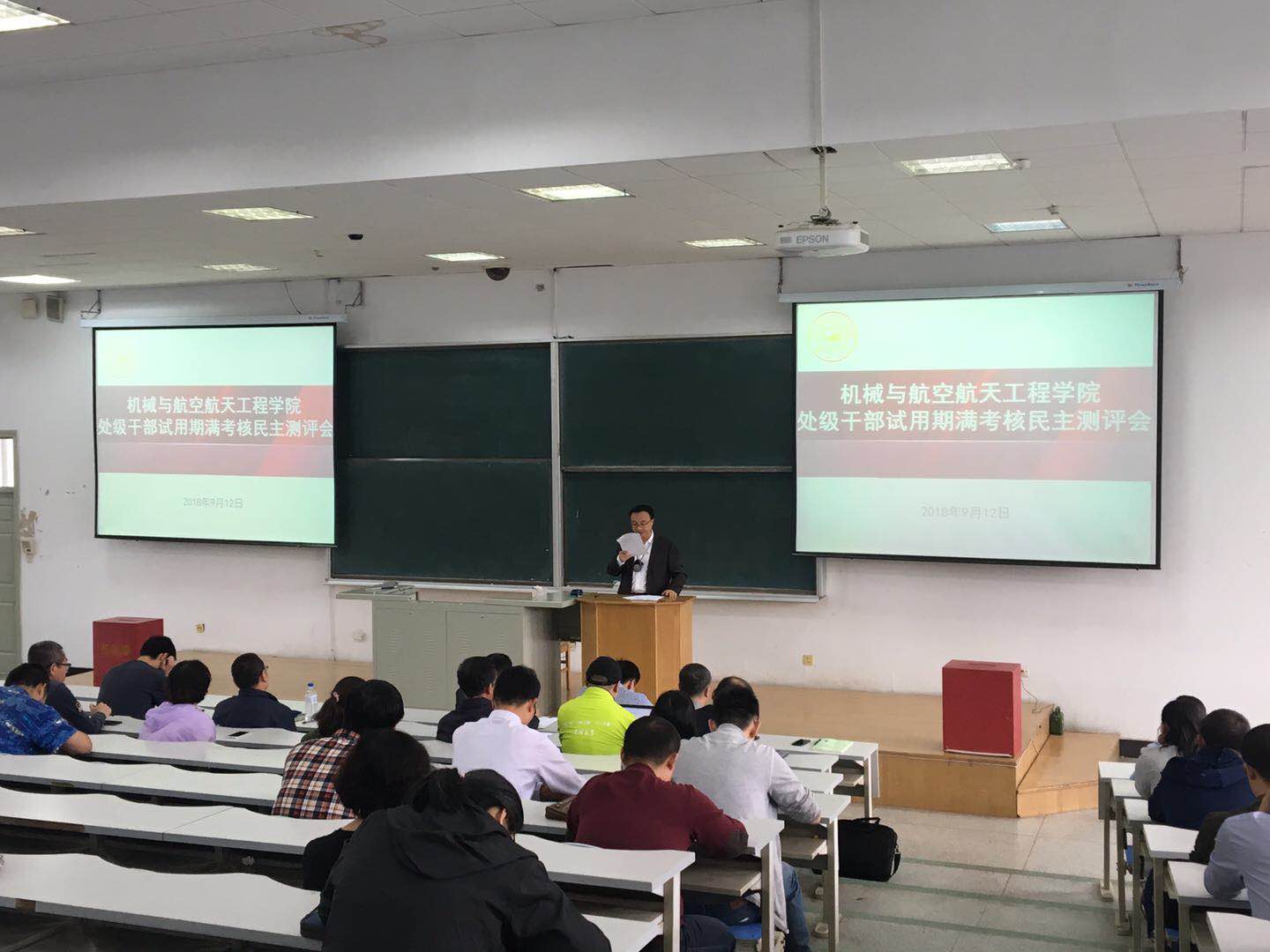 2018年9月12日下午,新葡的京集团8814在逸夫楼A411室召开处级干部试用期满考核民主测评会,学校党委组织部于生宗同志、杨可同志出席会议。学院全体教职工参加会议,大会由学院党委书记程钺同志主持。