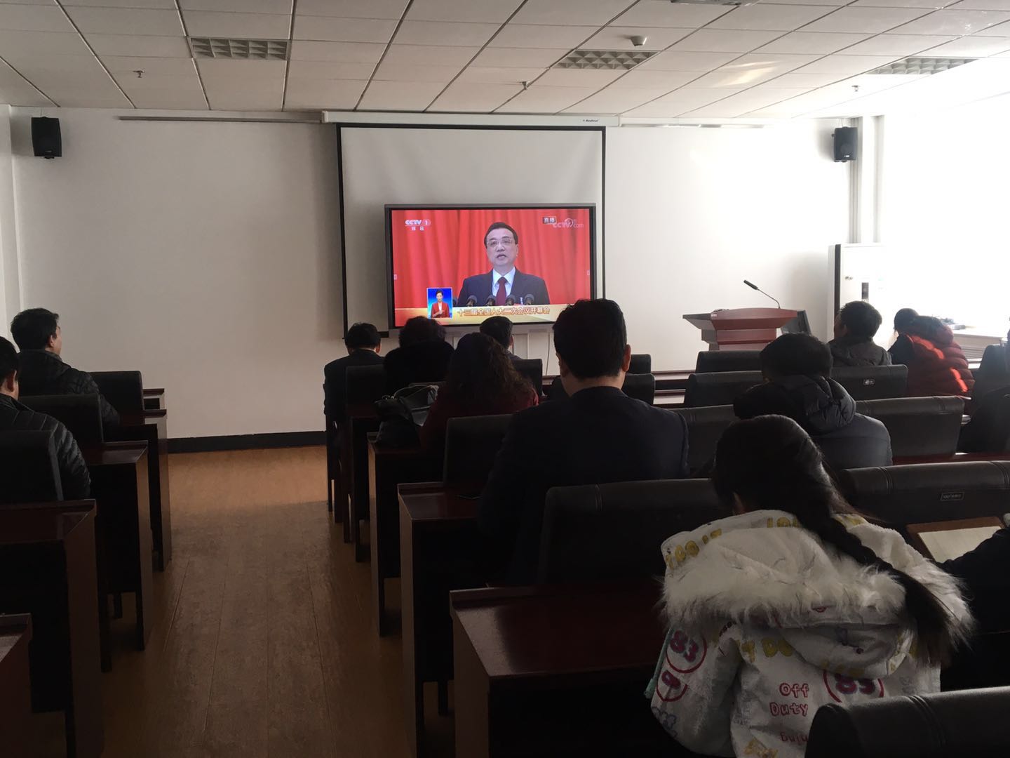 师生代表认真聆听国务院总理李克强所作的《政府工作报告》,在收听收看报告的过程中,会议室秩序井然,聚精会神,边看边做记录。