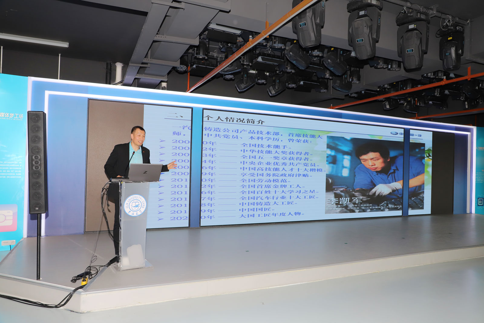 为深入贯彻落实习近平总书记关于弘扬“工匠精神”的讲话精神,勉励同学们志存高远、脚踏实地、勇担大任、精益求精,在中华民族伟大复兴的征程中共同创造幸福美好明天,新葡的京集团8814于10月21日下午在工程训练中心路演大厅举办了“大国工匠与工科学子共话工匠精神”系列报告会第二场活动。活动特邀全国劳动模范、一汽铸造有限公司产品技术部首席技能大师李凯军作了题为《立足本岗抒写匠心情怀,技能报国永筑国泰民安》的主题报告。学院党委书记郑福胜、东区学生办公室主任柴媛出席活动。报告会由工程训练中心副主任兼学院副院长刘鹏主持。百余名来自南岭校区各学院的师生参加了现场活动,活动在线上同步举行。
