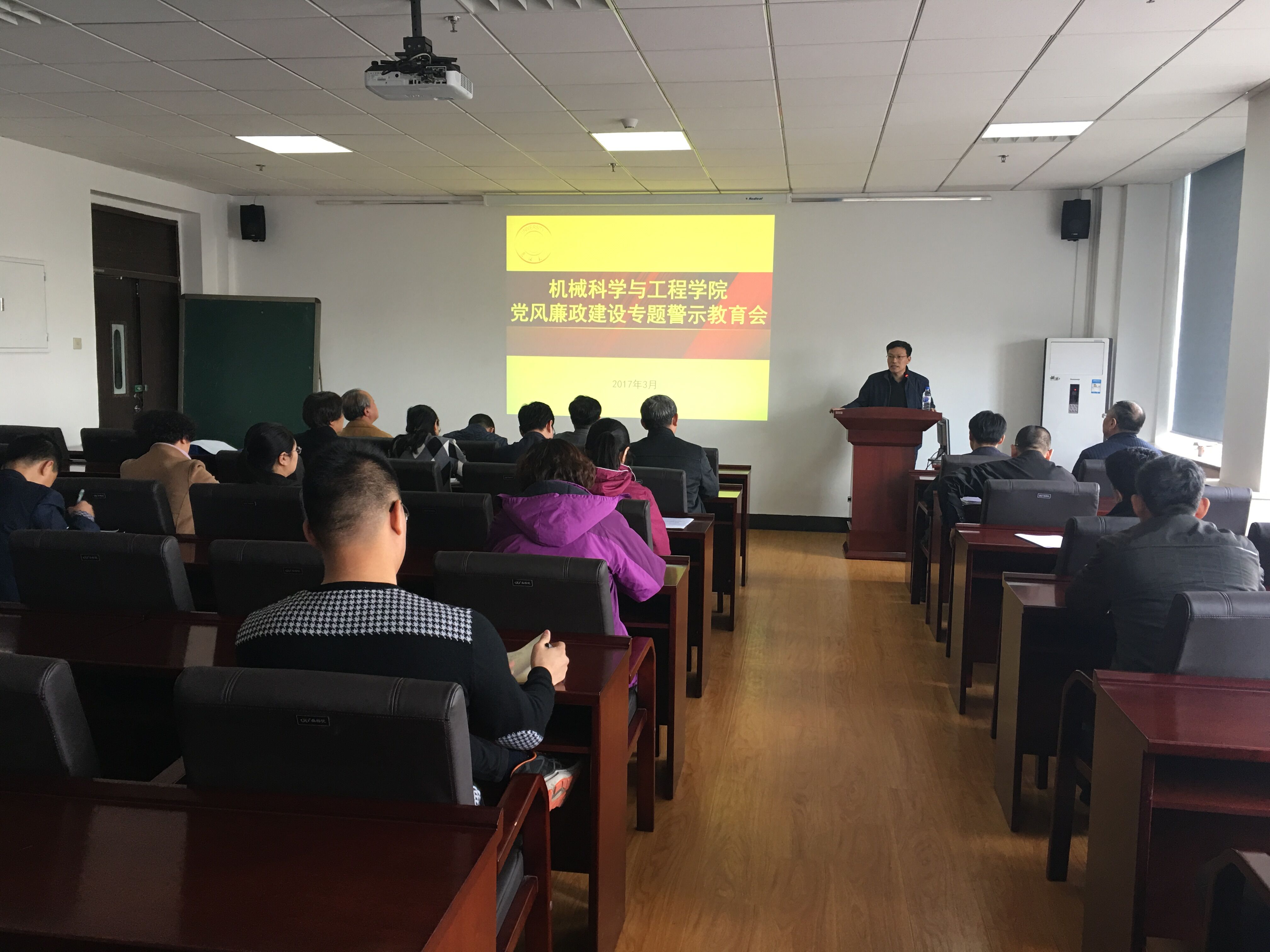 3月22日,机械科学与工程学院在机械馆召开党风廉政建设专题警示教育会。学院领导班子全体成员,党委委员、纪委委员、学术委员会主任委员、学位评定委员会主席、教学委员会主任委员、各系、室、中心主任、党支部书记、副书记,机关各科室主要负责人参加了会议。会议由学院党委书记程钺主持。