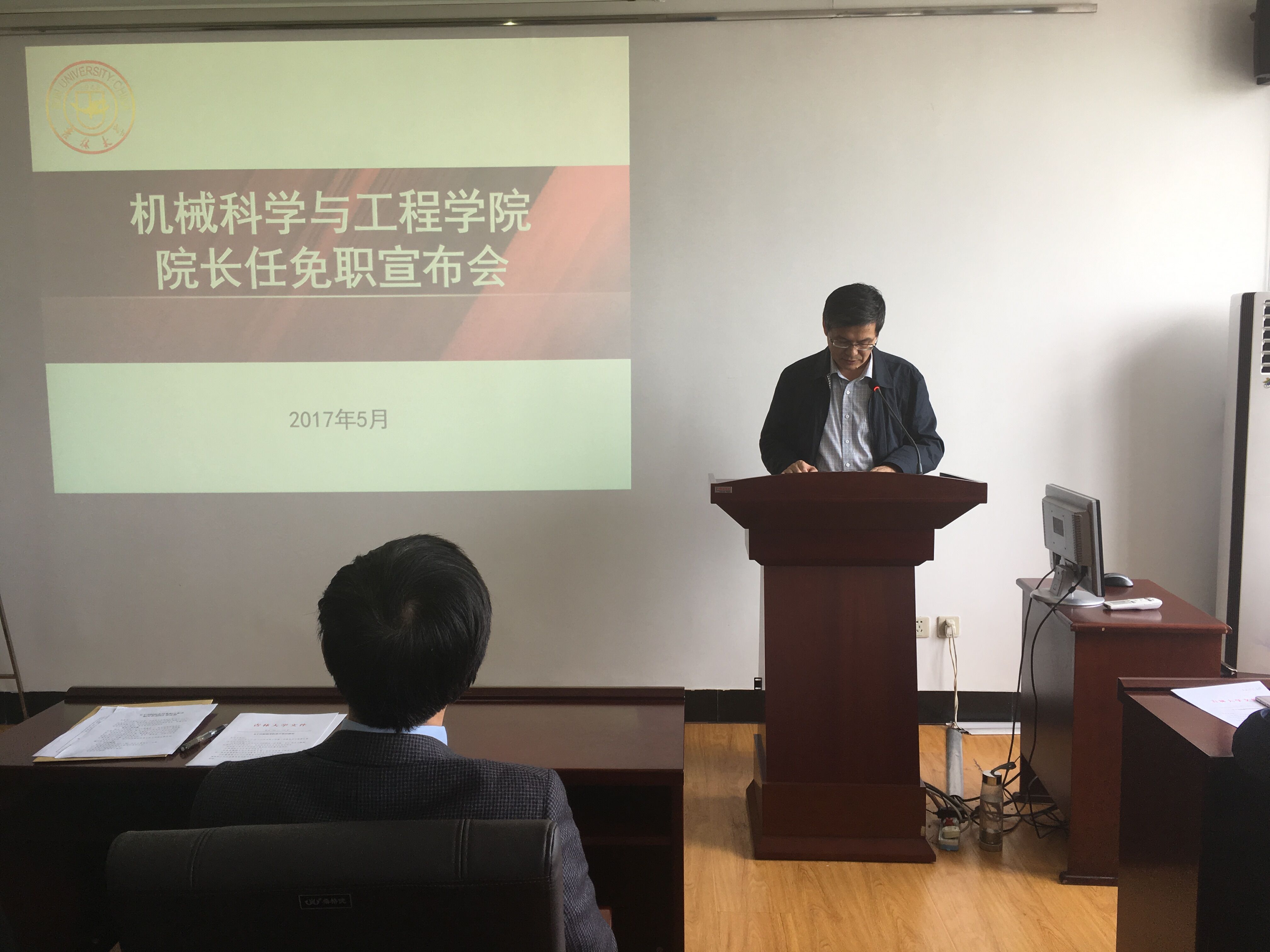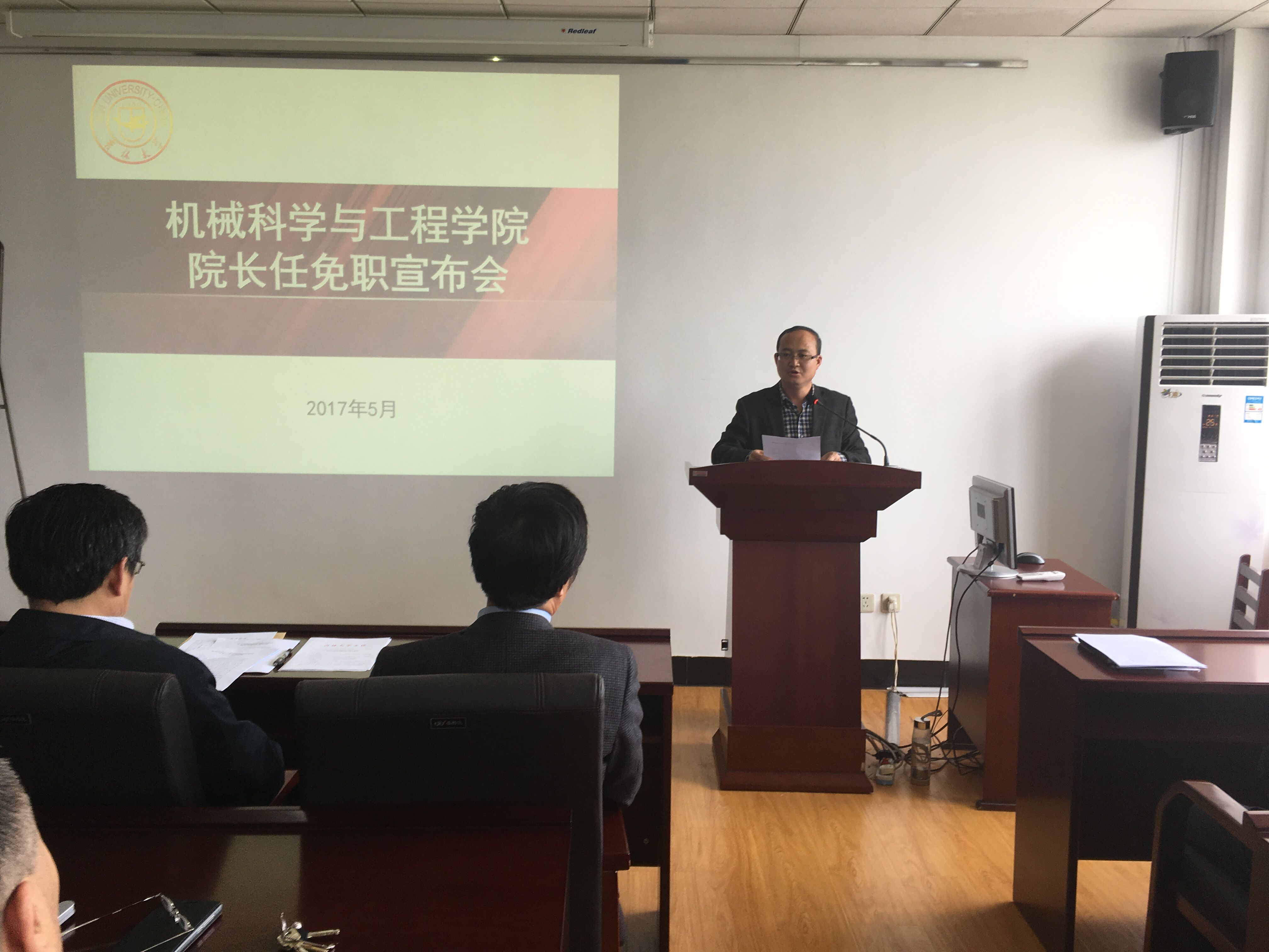 5月17日下午14点,机械科学与工程学院在机械馆529会议室召开院长任免职宣布会。副校长郑伟涛和组织部副部长张国兴出席会议并讲话,会议由学院党委书记程钺主持。学院班子成员、党委委员、纪委委员、系主任、教工党支部书记和机关全体人员参加了会议。