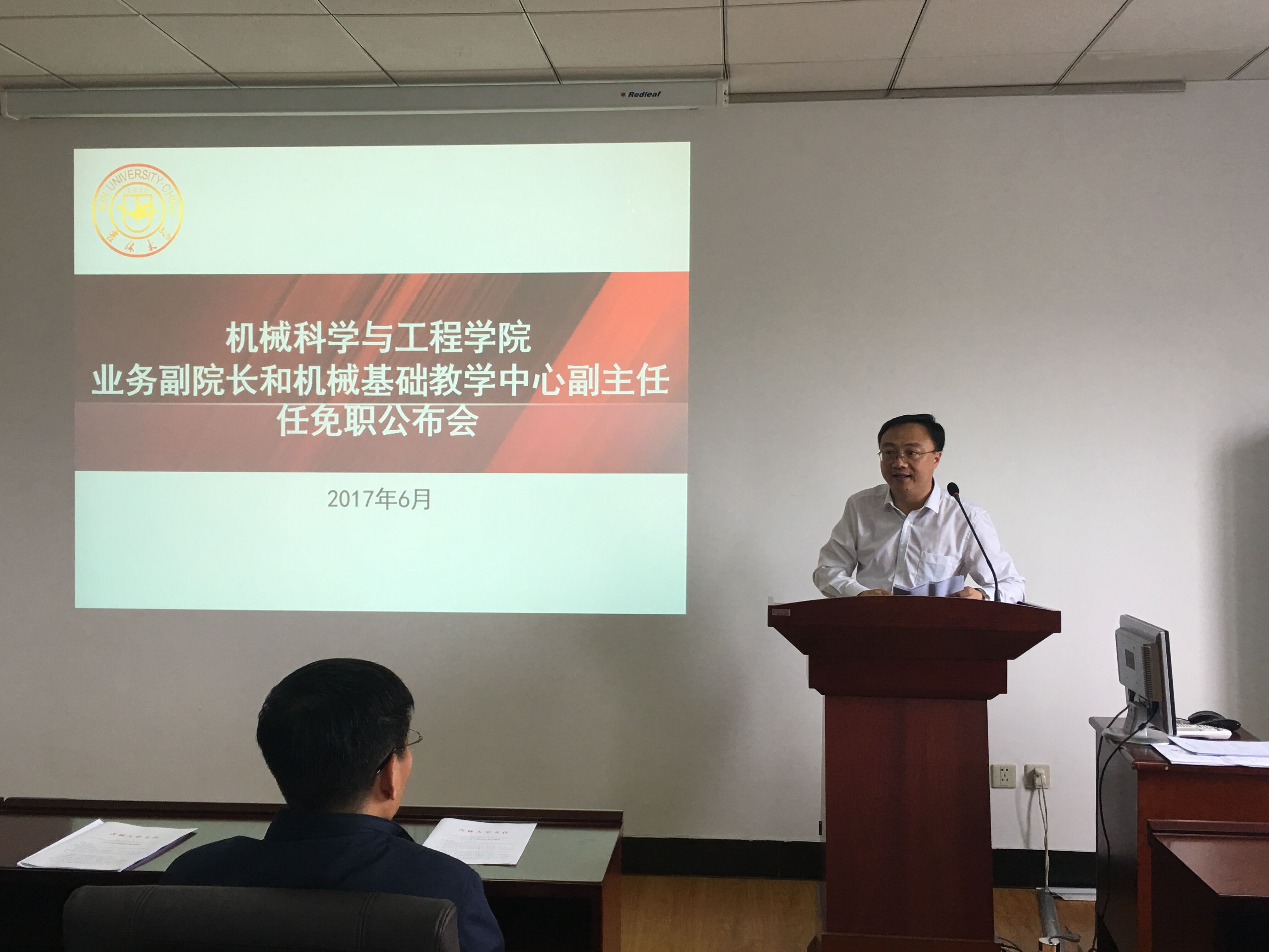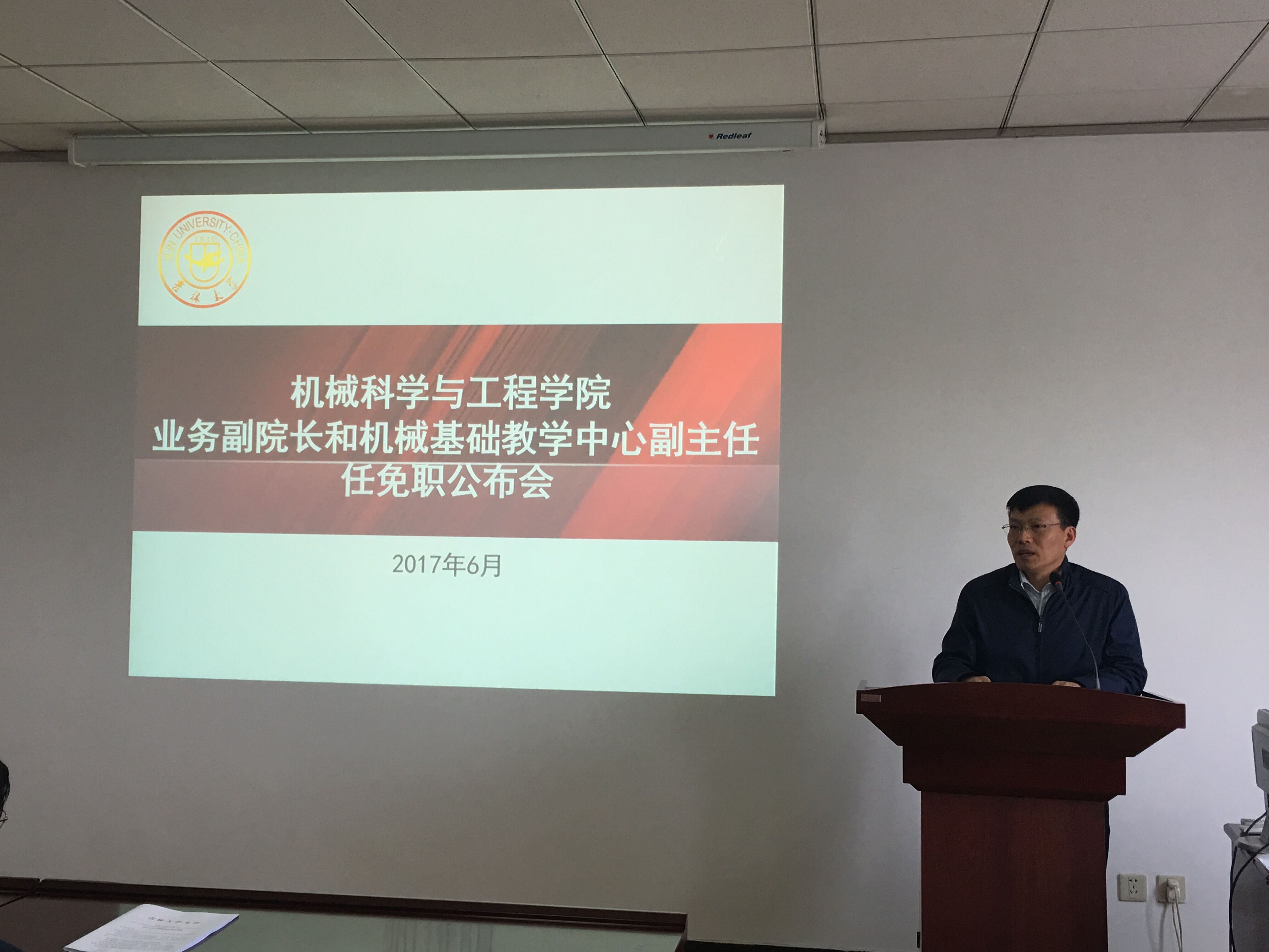 6月7日,机械科学与工程学院在机械馆召开业务副院长和机械基础教学中心副主任任免职宣布会。会议由学院党委副书记兼副院长郑福胜主持。学院班子成员、党委委员、纪委委员、学院学术委员会主任委员、学位评定分委员会主席、教学委员会主任委员、系主任、教工党支部书记和机关全体人员参加会议。