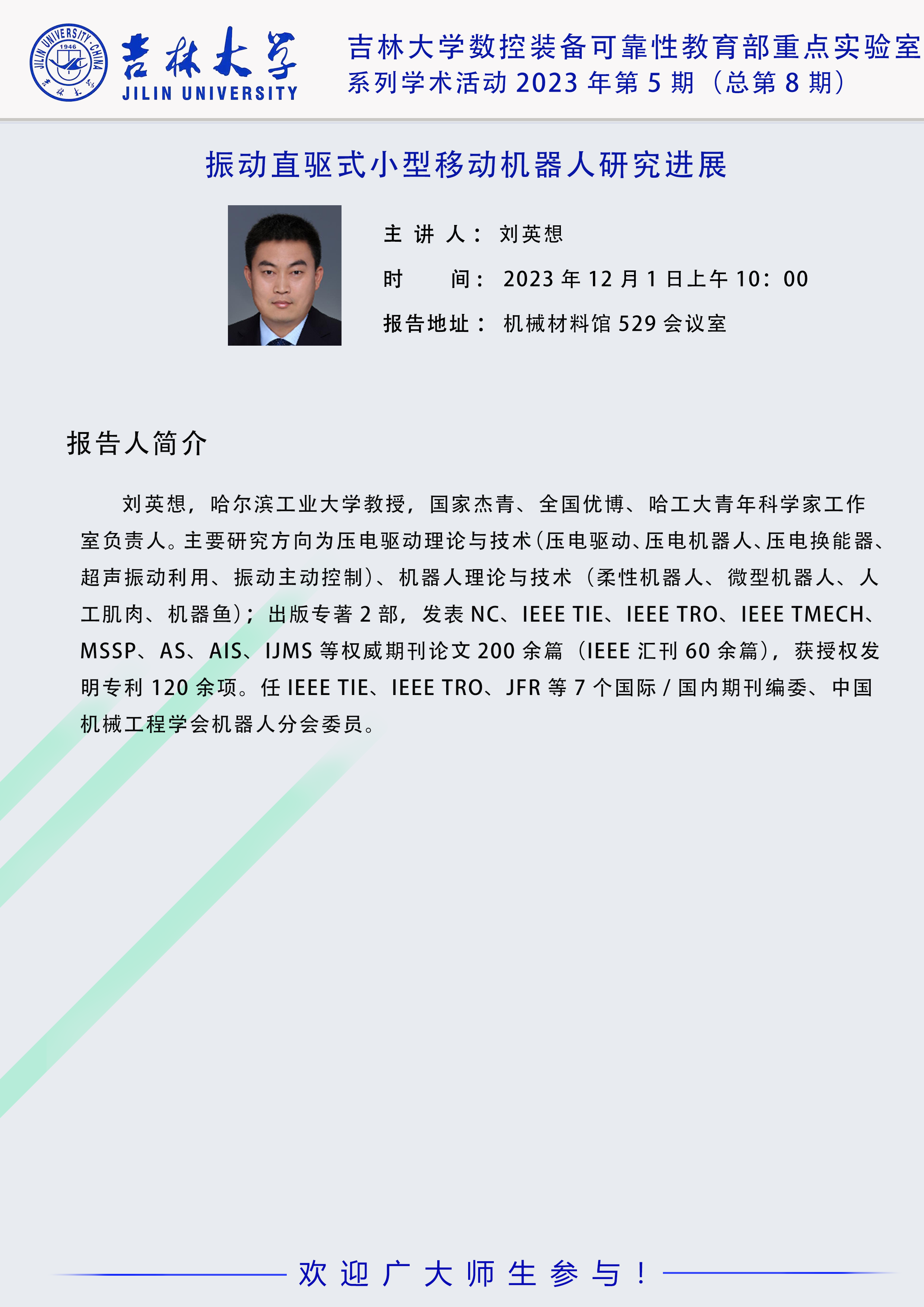 报告人简介:刘英想,国家杰青、全国优博、哈工大青年科学家工作室负责人。主要研究方向为压电驱动理论与技术(压电驱动、压电机器人、压电换能器、超声振动利用、振动主动控制)、机器人理论与技术(柔性机器人、微型机器人、人工肌肉、机器鱼);出版专著2部,发表NC、IEEE TIE、IEEE TRO、IEEE TMECH、MSSP、AS、AIS、IJMS等权威期刊论文200余篇(IEEE汇刊60余篇),获授权发明专利120余项。任IEEE TIE、IEEE TRO、JFR等7个国际/国内期刊编委,是中国机械工程学会机器人分会委员。