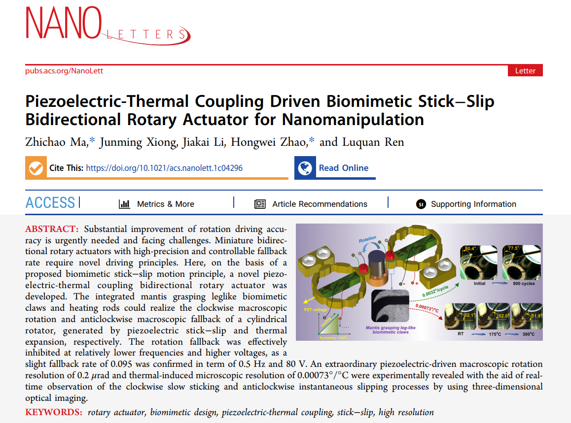 论文受国家自然科学基金(51875241)、国家重点研发计划项目(2018YFF010124)和吉林省科技发展计划项目(20190302078GX, YDZJ202101ZYTS129)的资助,以题为“Piezoelectric-thermal coupling driven biomimetic stick-slip bidirectional rotary actuator for nanomanipulation”发表在国际知名期刊Nano Letters (2020 IF:11.188)上。工程仿生教育部重点实验室任露泉院士给予了理论指导,赵宏伟教授和马志超教授为论文的共同通讯作者,马志超教授为论文第一作者,一年级硕士生熊俊名和本科生李傢楷参与了论文的试验工作。
