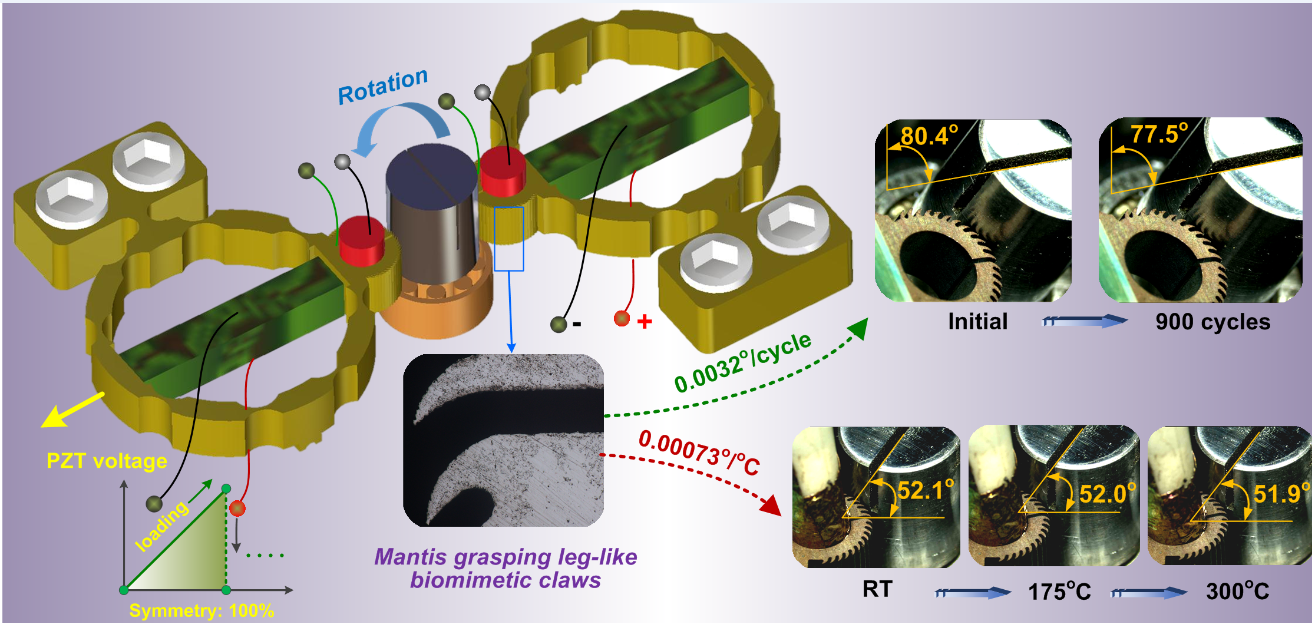 近期,吉林大学赵宏伟教授团队在超精密驱动器方面取得新进展。基于仿生粘滑运动原理,研制了一种新型压电-热耦合双向旋转驱动器。该驱动器通过螳螂前足式仿生爪和加热组件可以分别实现由压电粘滑和热膨胀效应产生的顺时针宏观旋转和逆时针回退。在相对较低的频率和较高的电压下,旋转回退被有效抑制。基于三维光学成像对顺时针缓慢粘滞和逆时针瞬时粘滞过程的实时观测,试验揭示了0.2μrad的压电驱动旋转分辨率和0.00073o/oC的热诱导微观分辨率。