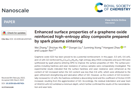 新一代装备技术的提升,对基础材料的性能要求愈加苛刻。全世界每年因各种形式磨损引起的零件损坏比例高达80%,提升材料表面力学性能有助于延长其服役寿命。在传统金属材料不能满足要求的状况下,金属基复合材料提供了新的契机。近期,吉林大学赵宏伟教授团队在纳米复合材料表面改性方面取得了新进展。相关论文以题为“Enhanced surface properties of a graphene oxide reinforced high-entropy alloy composite prepared by spark plasma sintering”发表在知名学术期刊Nanoscale上,同时被选为当期内封面论文。