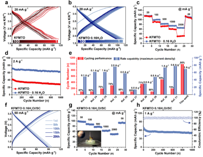 本工作提出了一种简单且通用的多功能水合策略,同时实现了钾基层状氧化物正极空气稳定性和电化学性能的全面提升。利用材料本征的结构特点巧妙地将水分子引入到碱金属层中,通过改变反应时长调控水分子嵌入量,得到新的钾基层状氧化物正极材料。该策略为层状材料空气稳定性的解决提供了新的途径,可以降低钾离子电池正极材料的制备成本,提高了钾离子电池在下一代大规模储能系统中的竞争力。