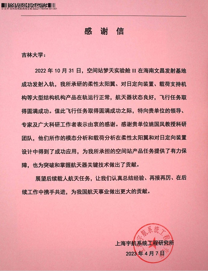 2022年10月31日,空间站梦天实验舱II在海南文昌发射基地成功发射入轨,我所承研的柔性太阳翼、对日定向装置、载荷支持机构等大型结构机构产品在轨运行正常,航天器状态良好,飞行任务取得圆满成功。值此飞行任务取得圆满成功之际,特向贵单位的领导、专家及广大科研工作者表示由衷的感谢。感谢贵单位姚国凤教授科研团队,他们所作的模态分析和载荷分析在柔性太阳翼和对日定向装置设计中得到了成功应用,为我所承担的空间站产品任务提供了有力保障,也为突破和掌握航天器关键技术做出了贡献。