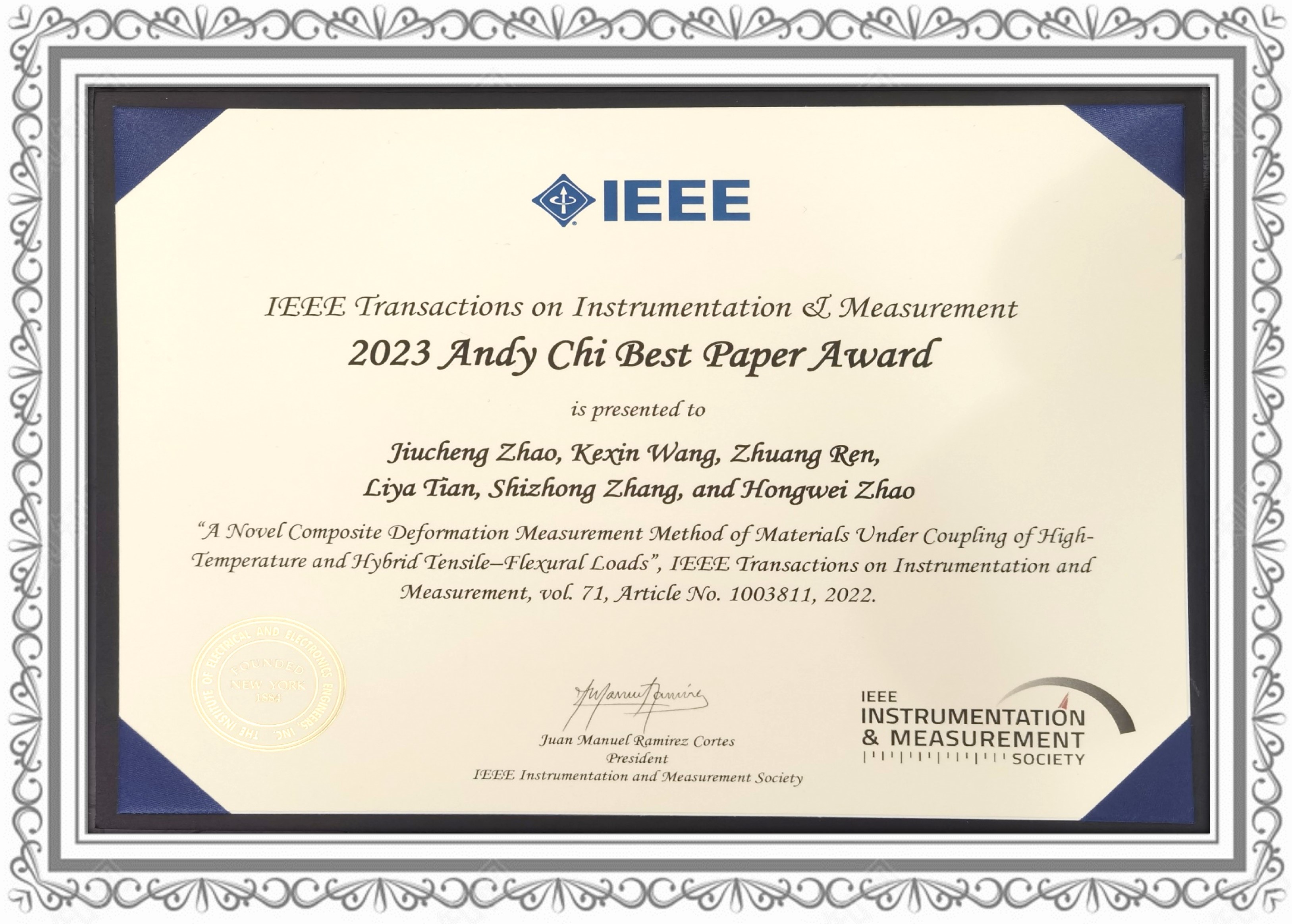 IEEE TIM Andy Chi最佳论文奖,旨在表彰在仪器仪表和测量(TIM)领域具有重要创新性、影响力和应用价值的成果。我校本届获奖论文,经过严格评审程序,从2022年IEEE TIM期刊正式出版的1714篇论文中脱颖而出,成为年度唯一获奖论文。本次获奖,使我校成为继清华大学和哈尔滨工业大学之后国内第6个获该奖项的高校,表明我校在模拟复杂工况材料-构件使役性能测评技术与仪器方面的研究工作充分得到国际认可。