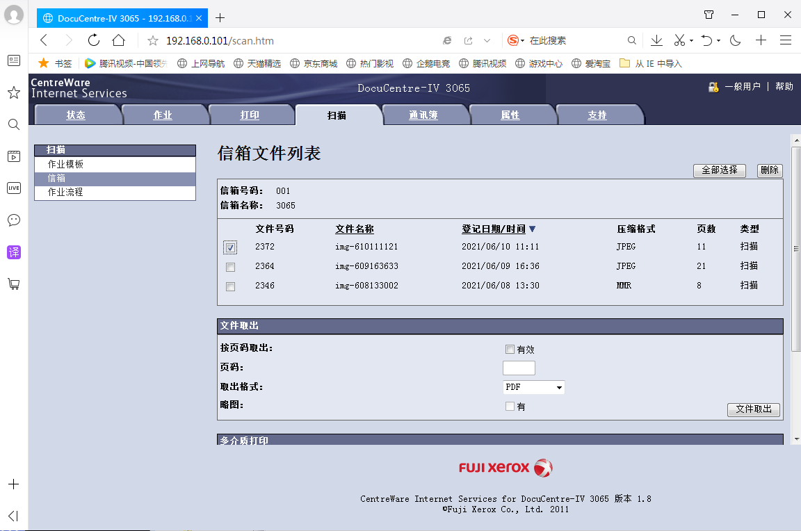 3.选择标签页“扫描”左下的“信箱”,并在“信箱文件列表”中选中相应文件,“取出格式”下拉选择PDF,点击“文件取出”。