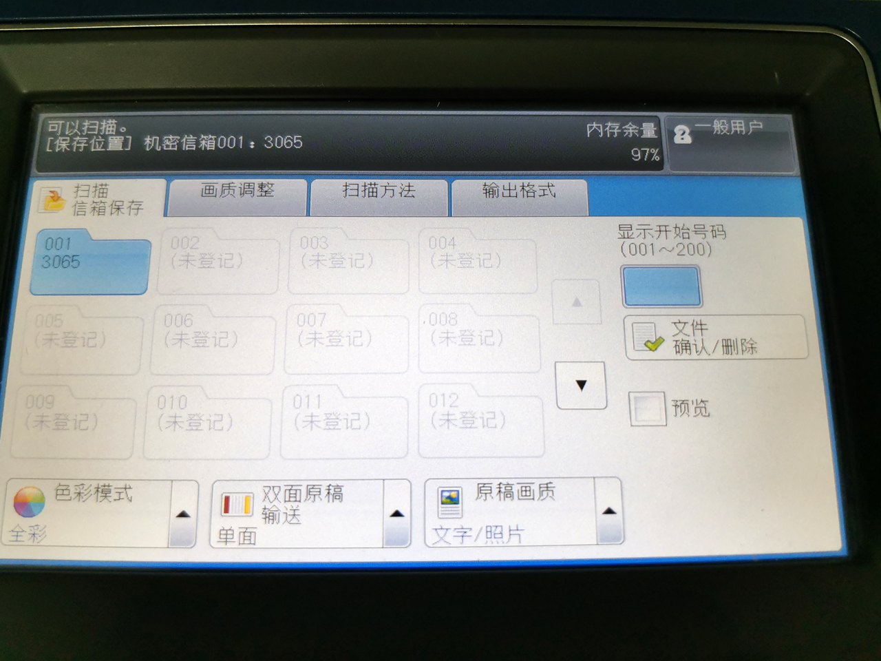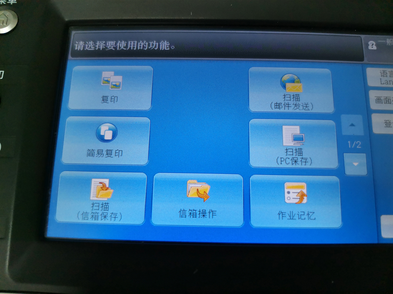1.复印机主菜单,左下角“扫描(信箱保存)”。