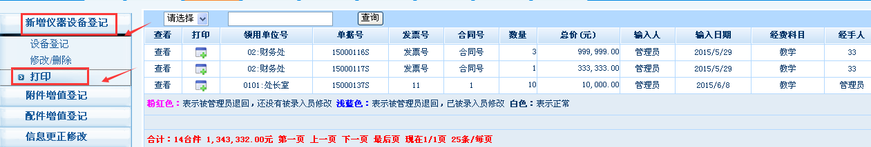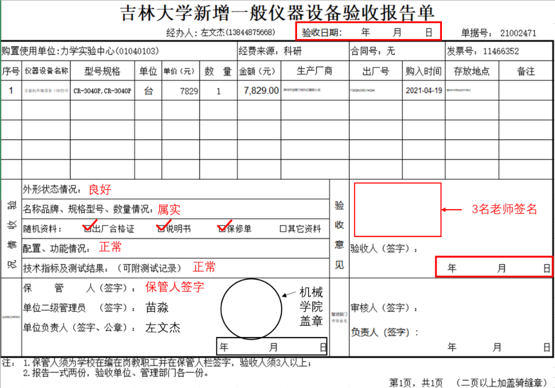 机械学院二级管理员苗淼(机械材料馆506)进行初审。初审通过后,点击【验收录入】→【新增设备登记】→【打印】,即可打印“新增仪器设备验收报告单”。