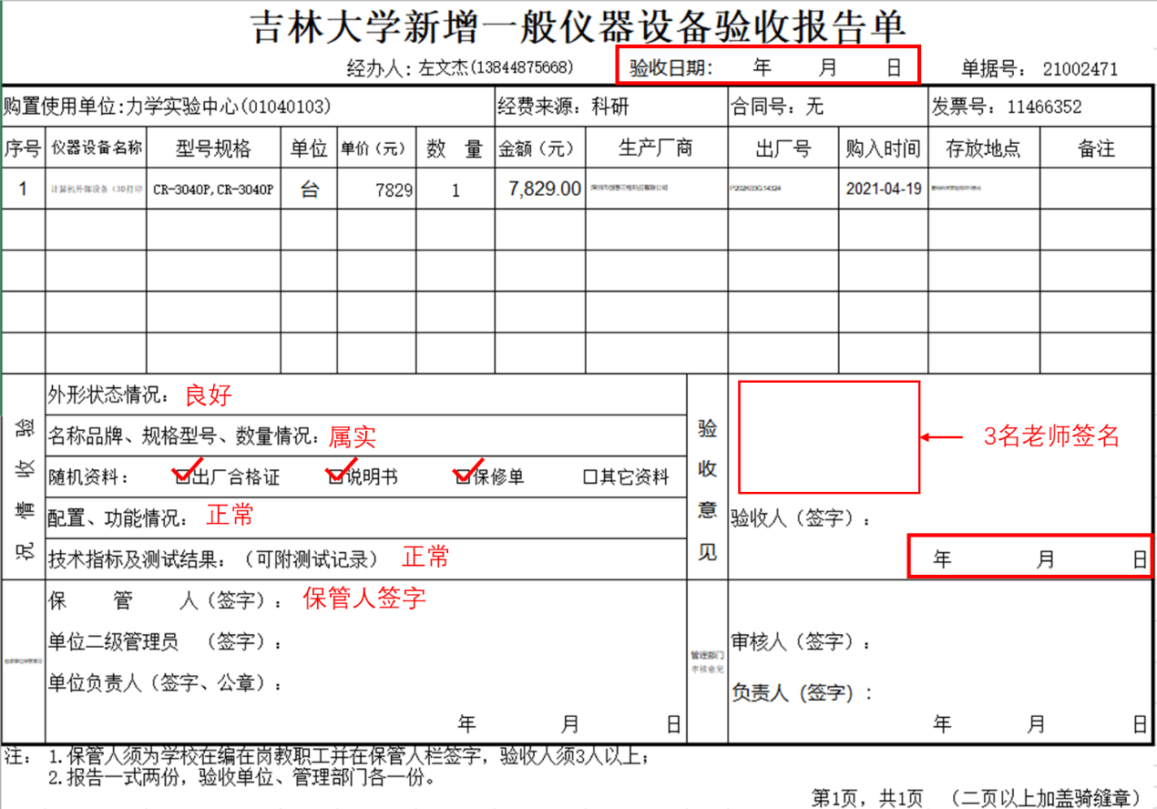 在进行固定资产复审前,须在仪器设备验收报告单上填写内容如下: