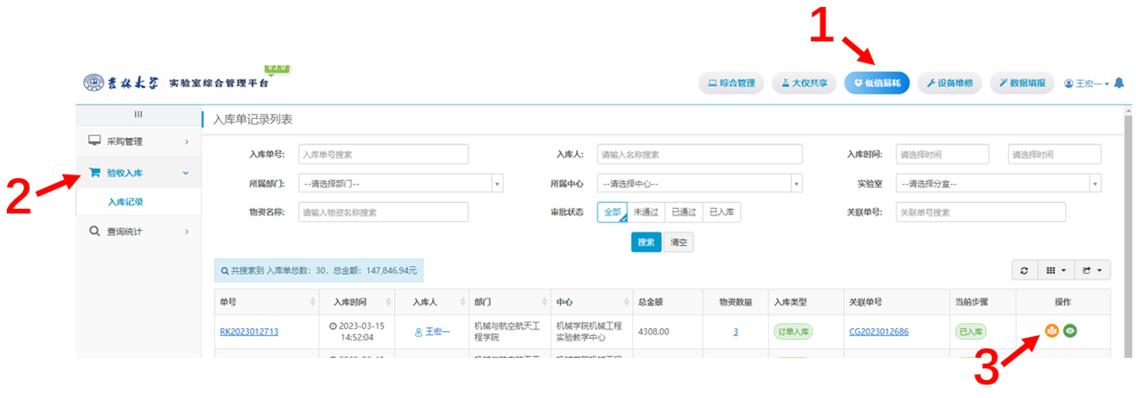 验收人审批均完成后,如下图依次点击,在入库记录中选择对应入库单打印:(1)低值易耗 (2)验收入库 (3)打印图标。在此界面也可查看审批进度,部分入库单最后需要学院徐媛媛老师入库审批,一般徐老师工作日每天都会审批,无需特意联系。